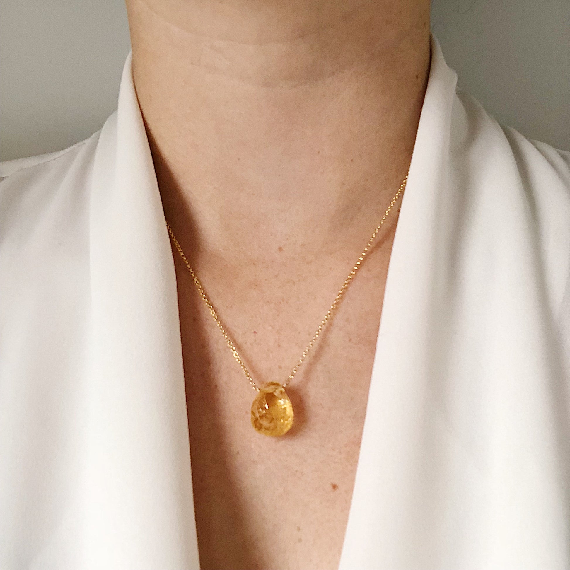 This necklace is pictured with Vermeil chain (22k overlay with Sterling Silver core) but can also be made with Sterling Silver chain, and is a great option for those with sensitivities to base metals. It is approximately 18" in length overall, and the teardrop being approximately 5/8 inches high by 1/2 inch wide. Please allow for slight differences in size and coloring (10% variance maximum) as each teardrop is unique!