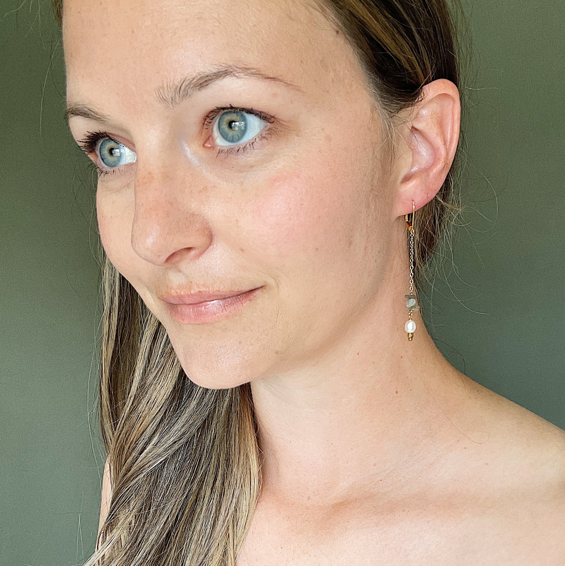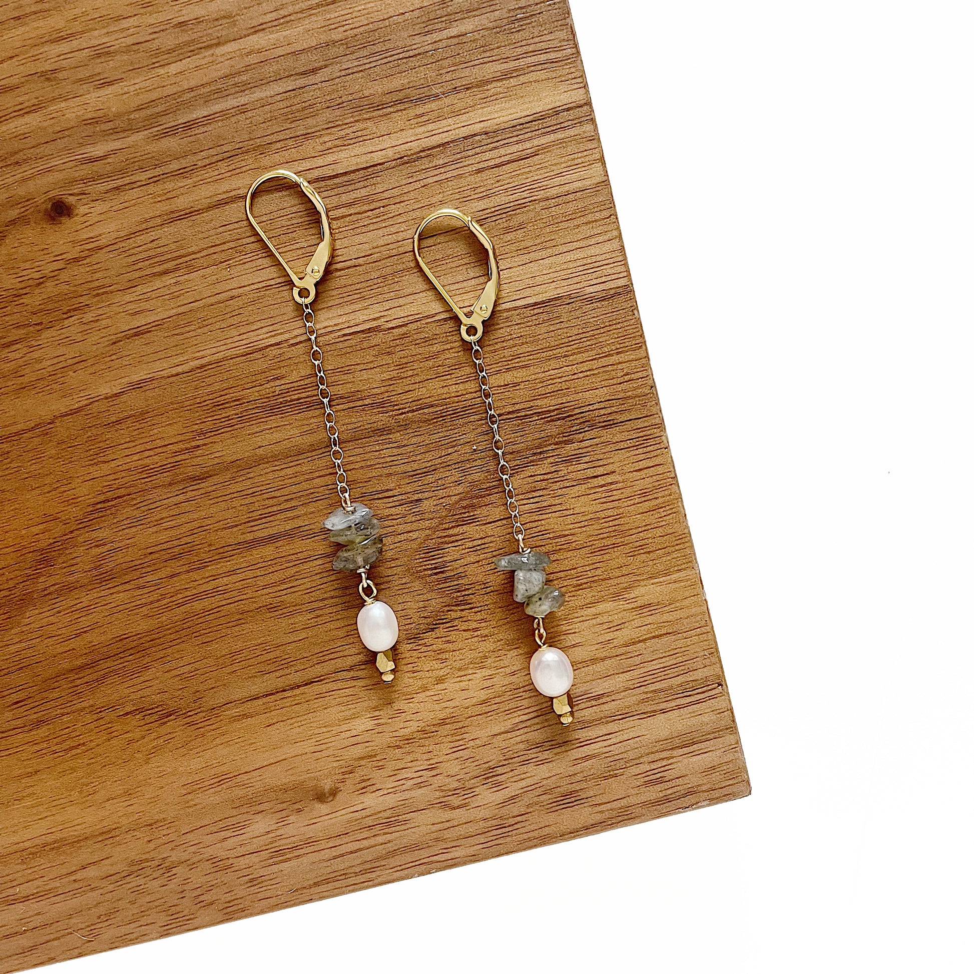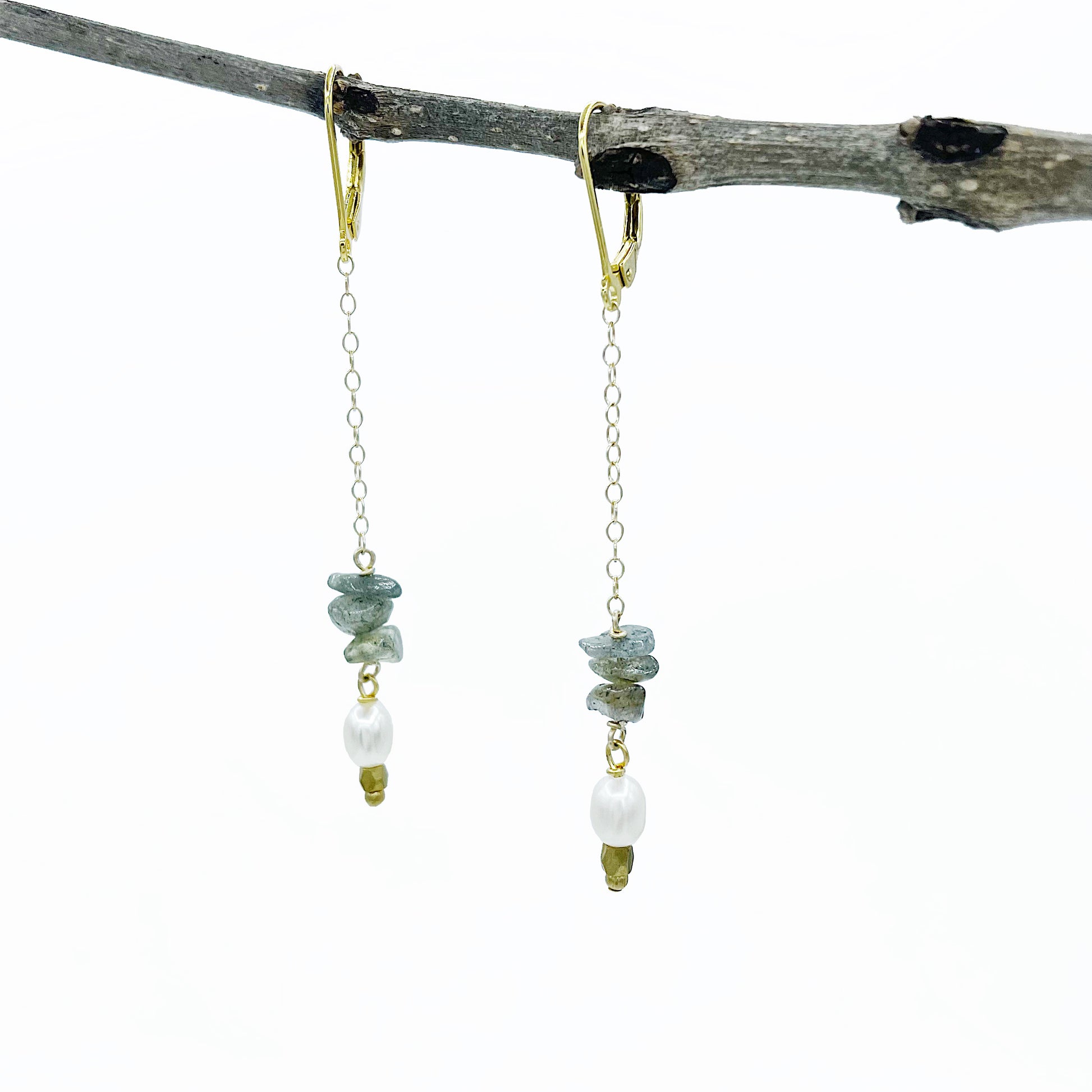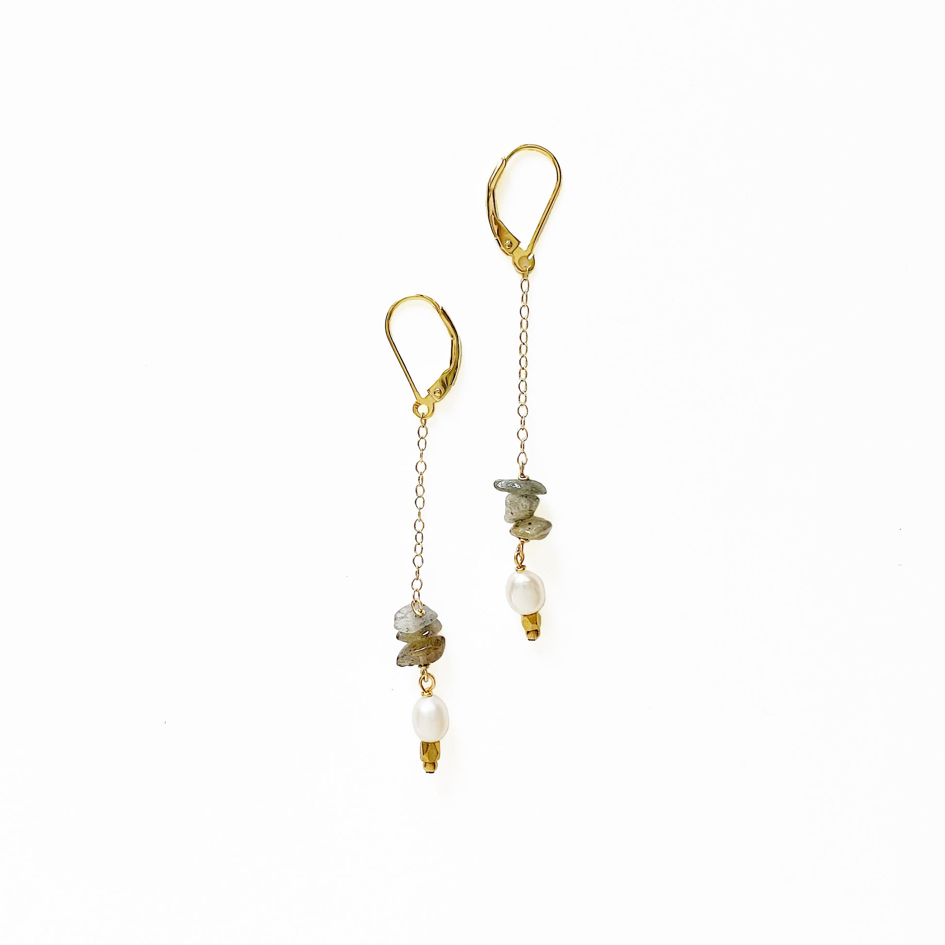The Pallene Earrings: gray/green labradorite, white fresh water pearls, brass square accents, 14k gold fill chain and vermeil lever-back earrings create this lightweight neutral earring set.