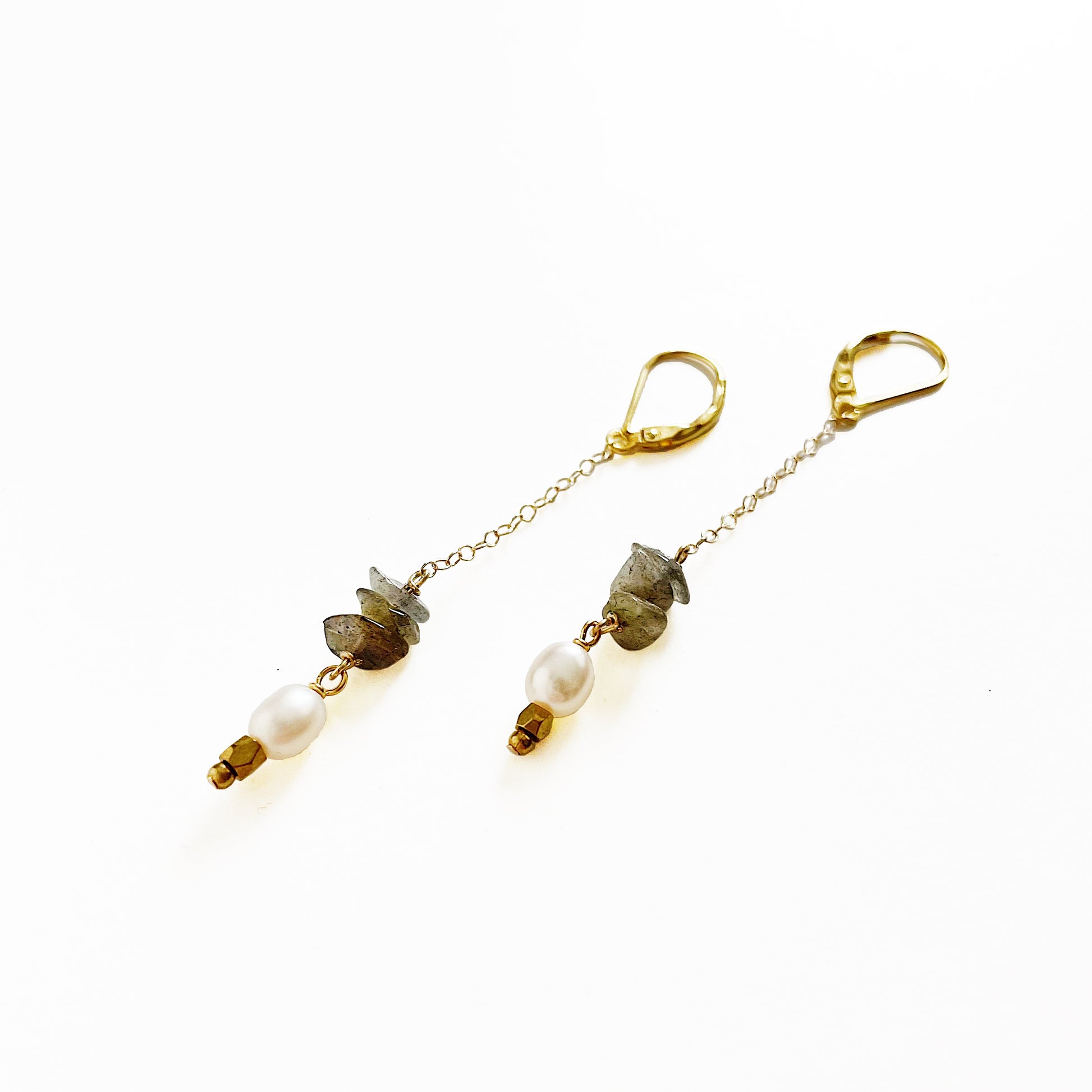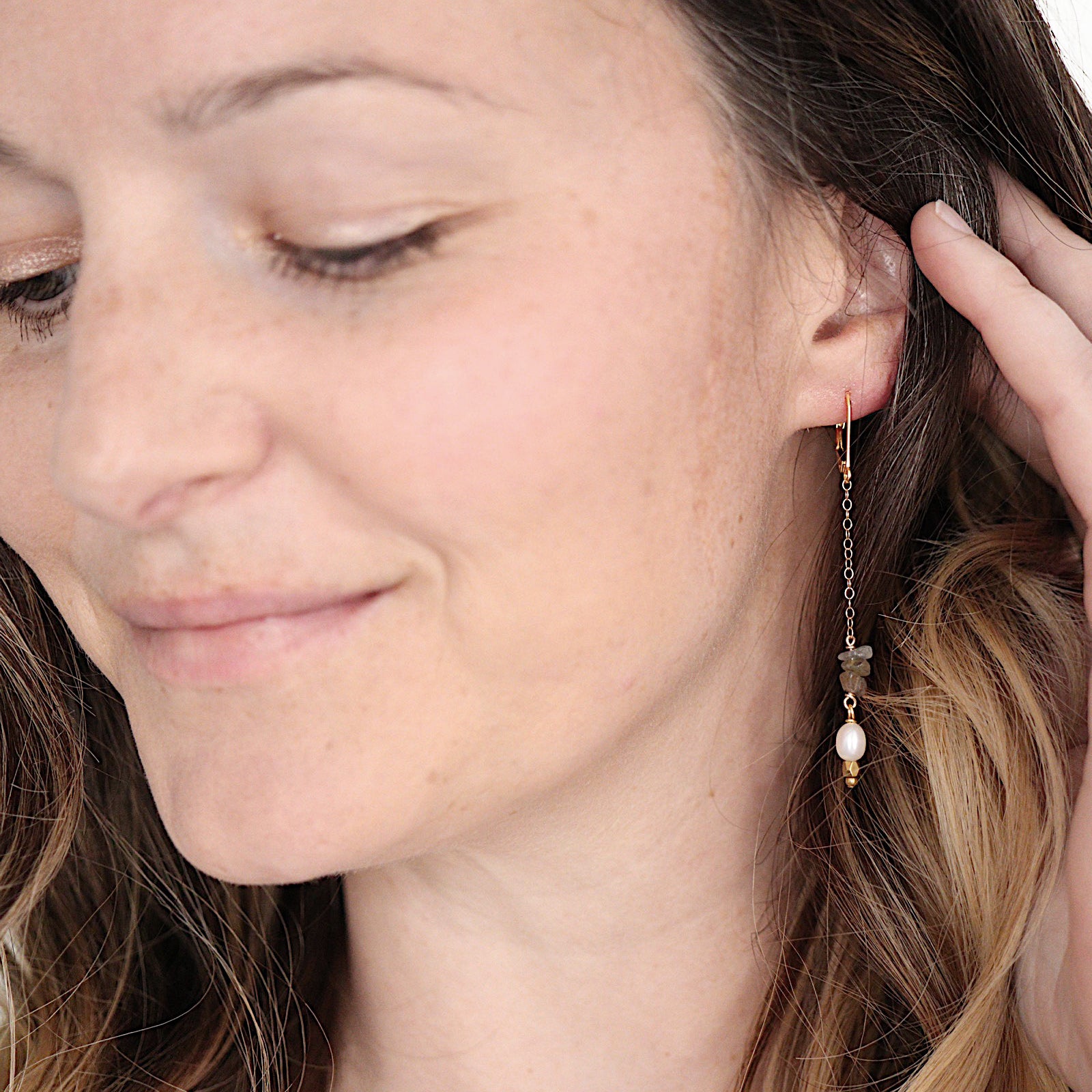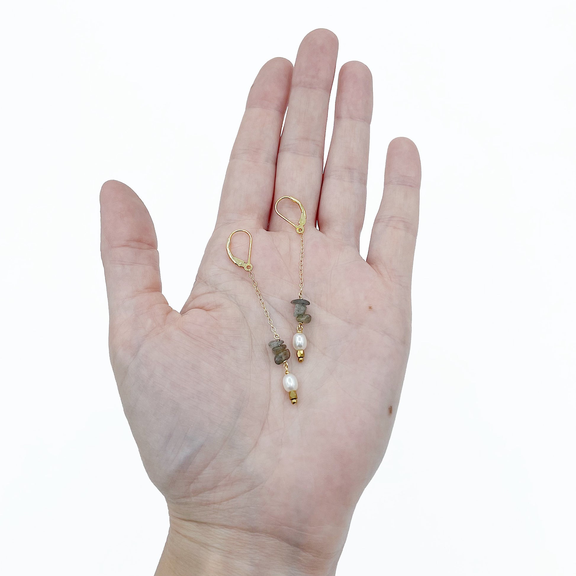 The Pallene Earrings: gray/green labradorite, white fresh water pearls, brass square accents, 14k gold fill chain and vermeil lever-back earrings create this lightweight neutral earring set.