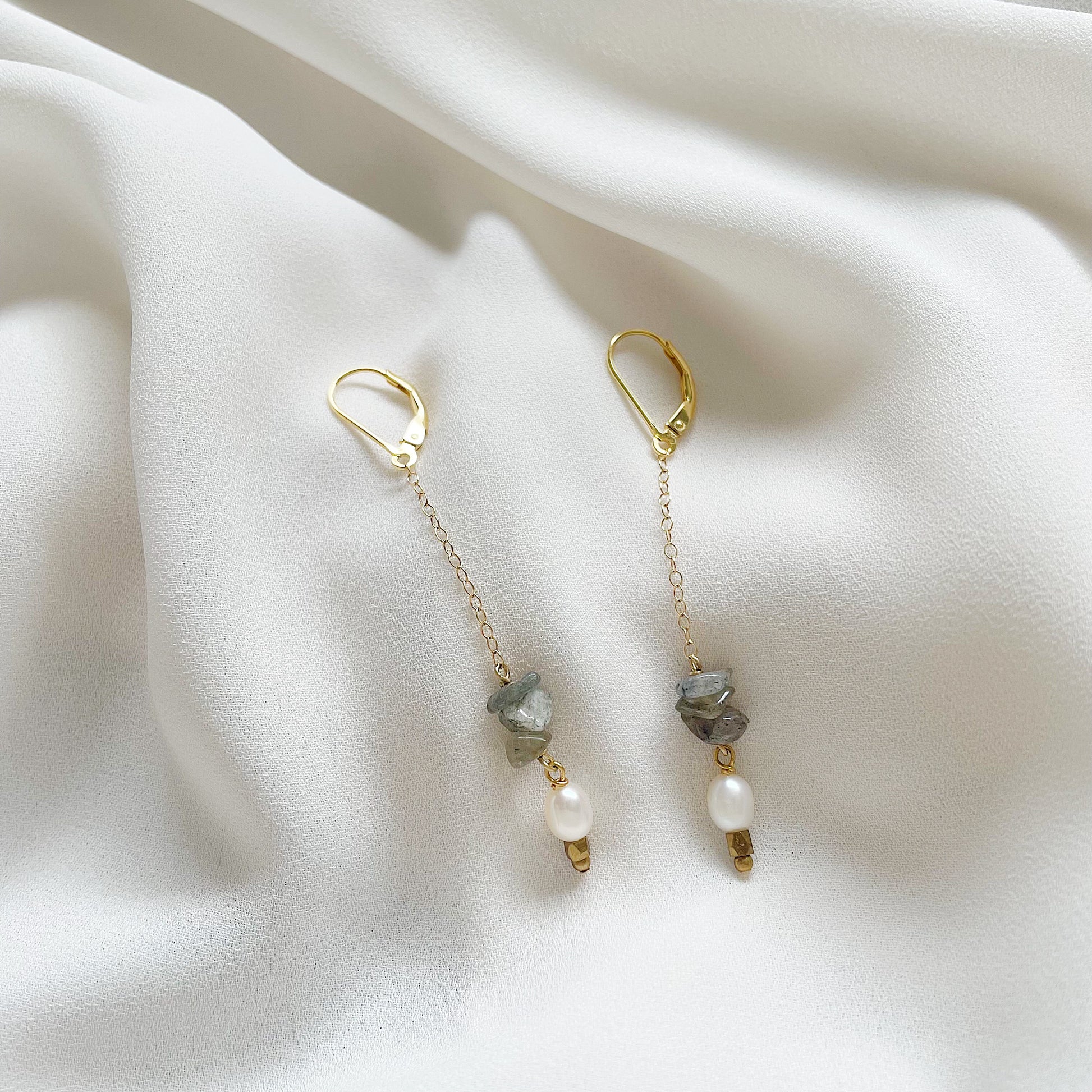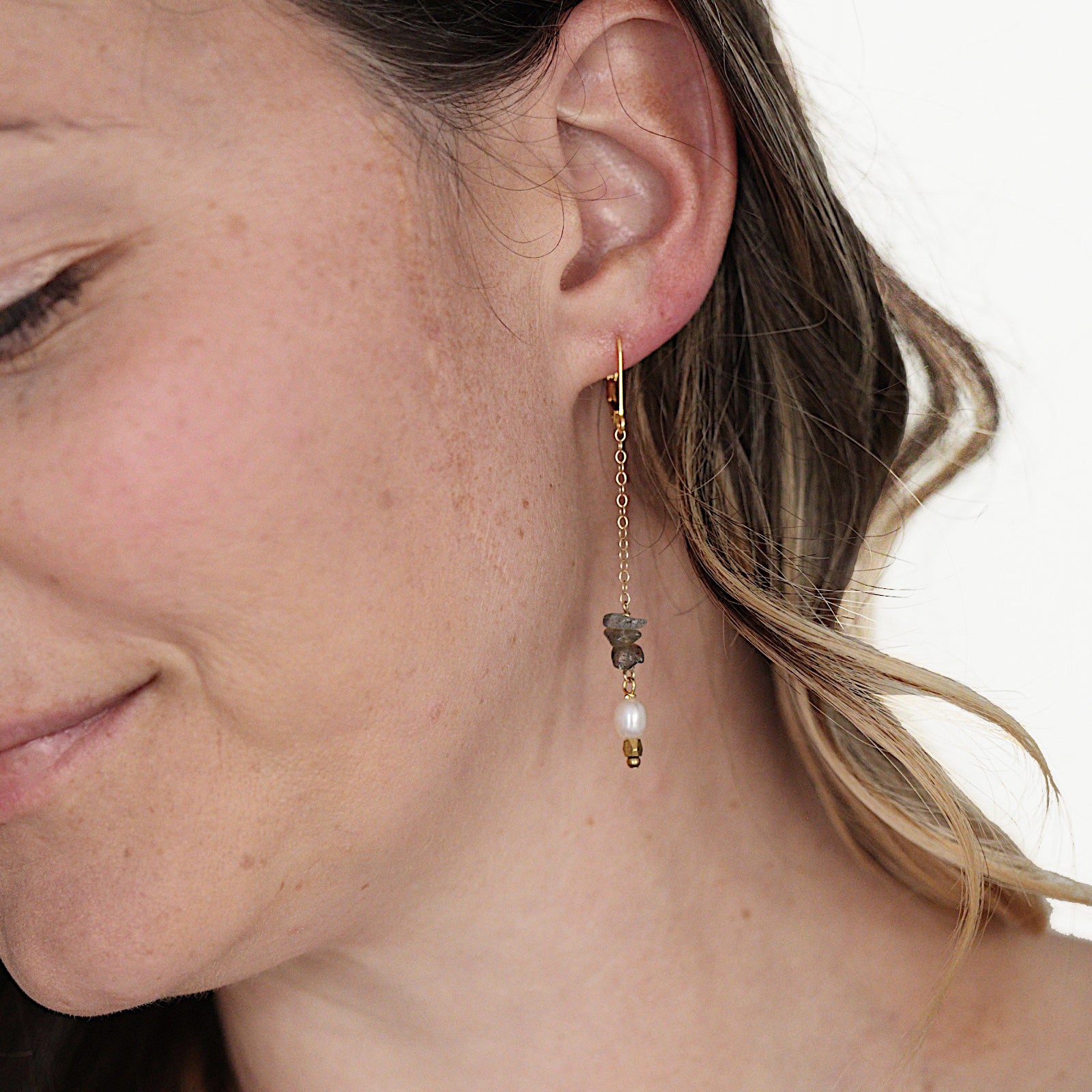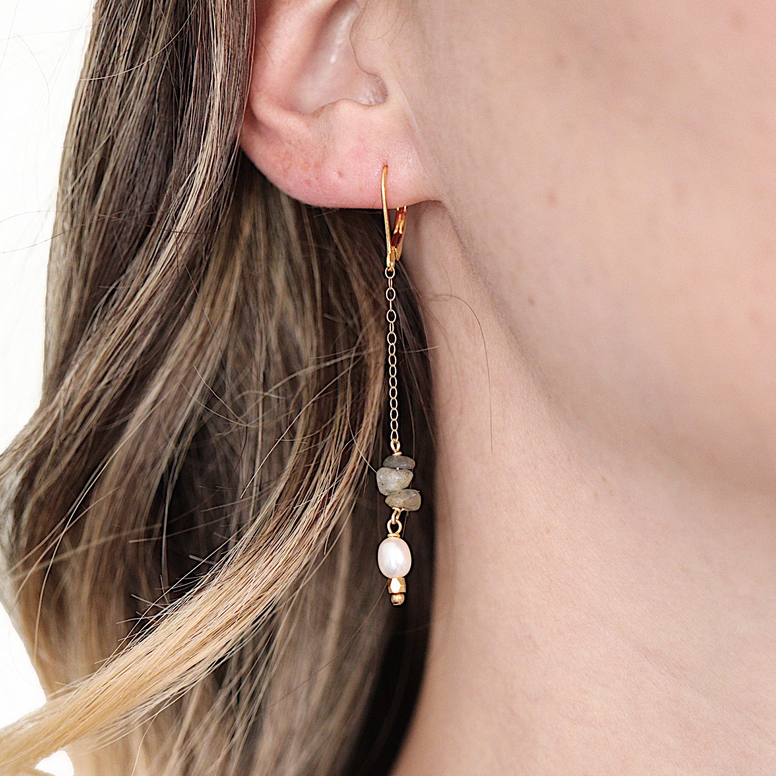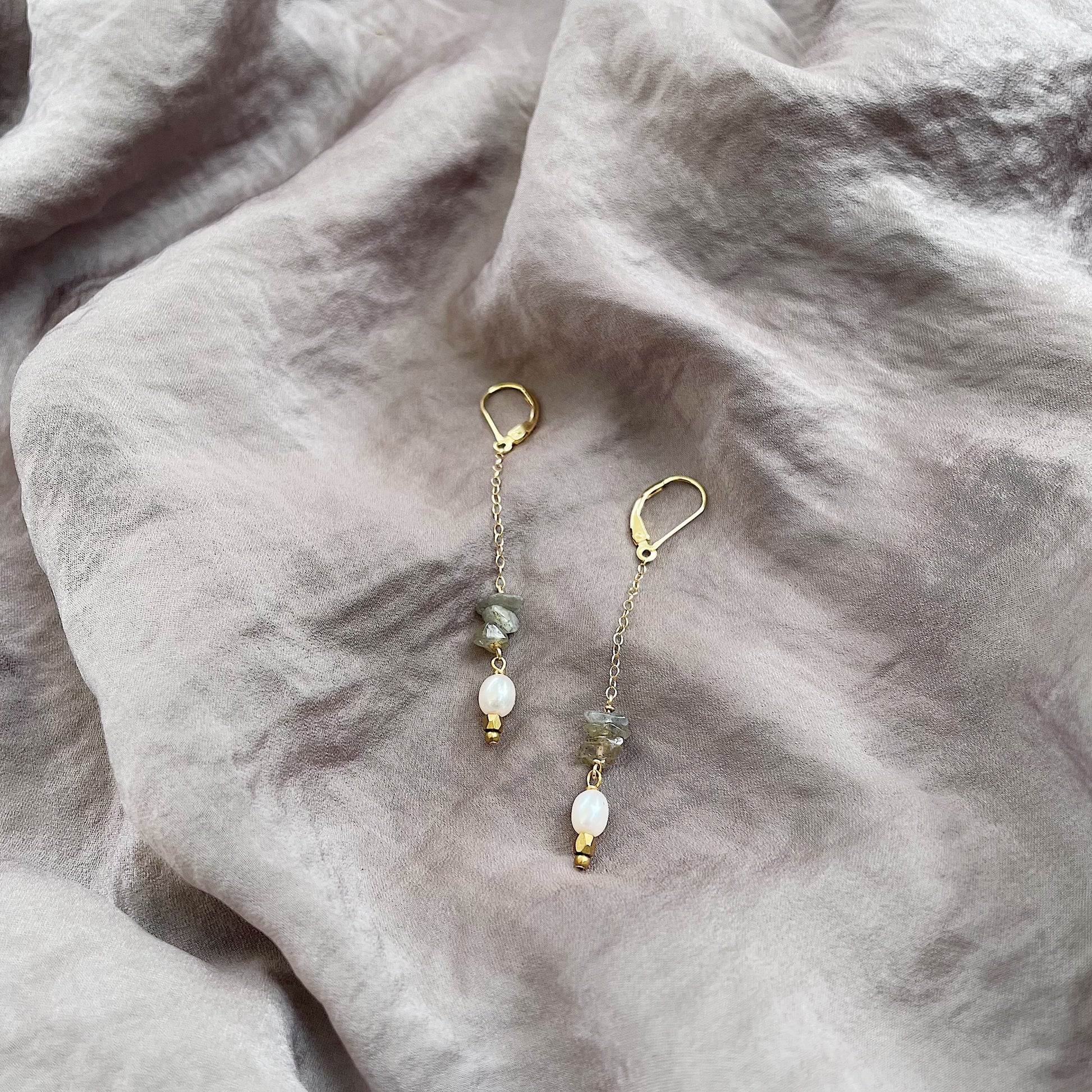 The Pallene Earrings: gray/green labradorite, white fresh water pearls, brass square accents, 14k gold fill chain and vermeil lever-back earrings create this lightweight neutral earring set.
