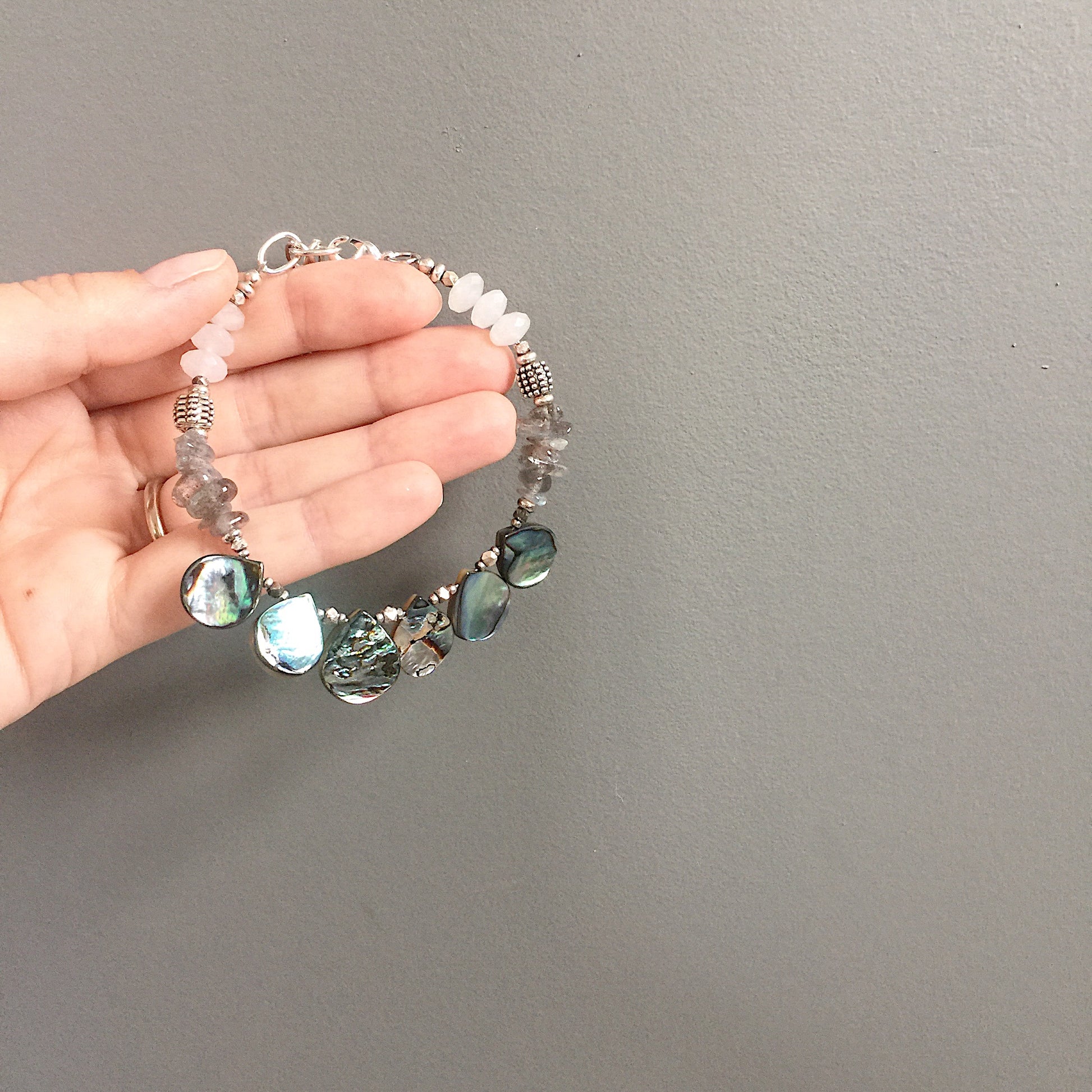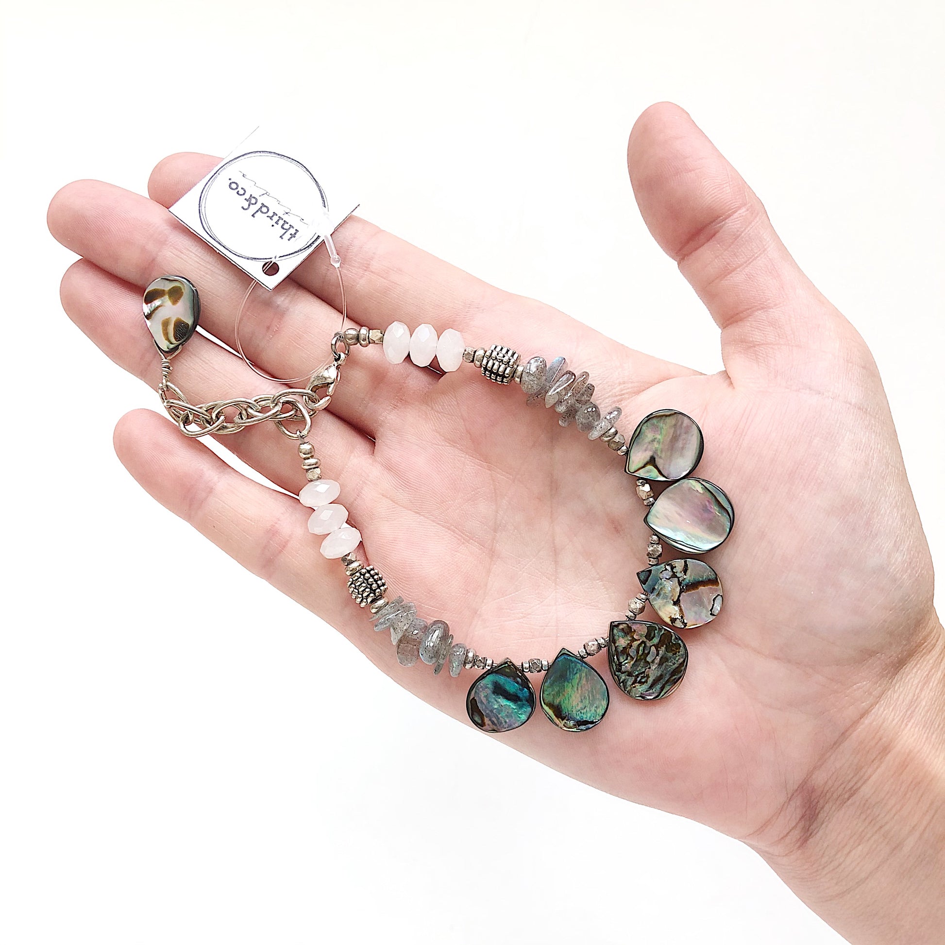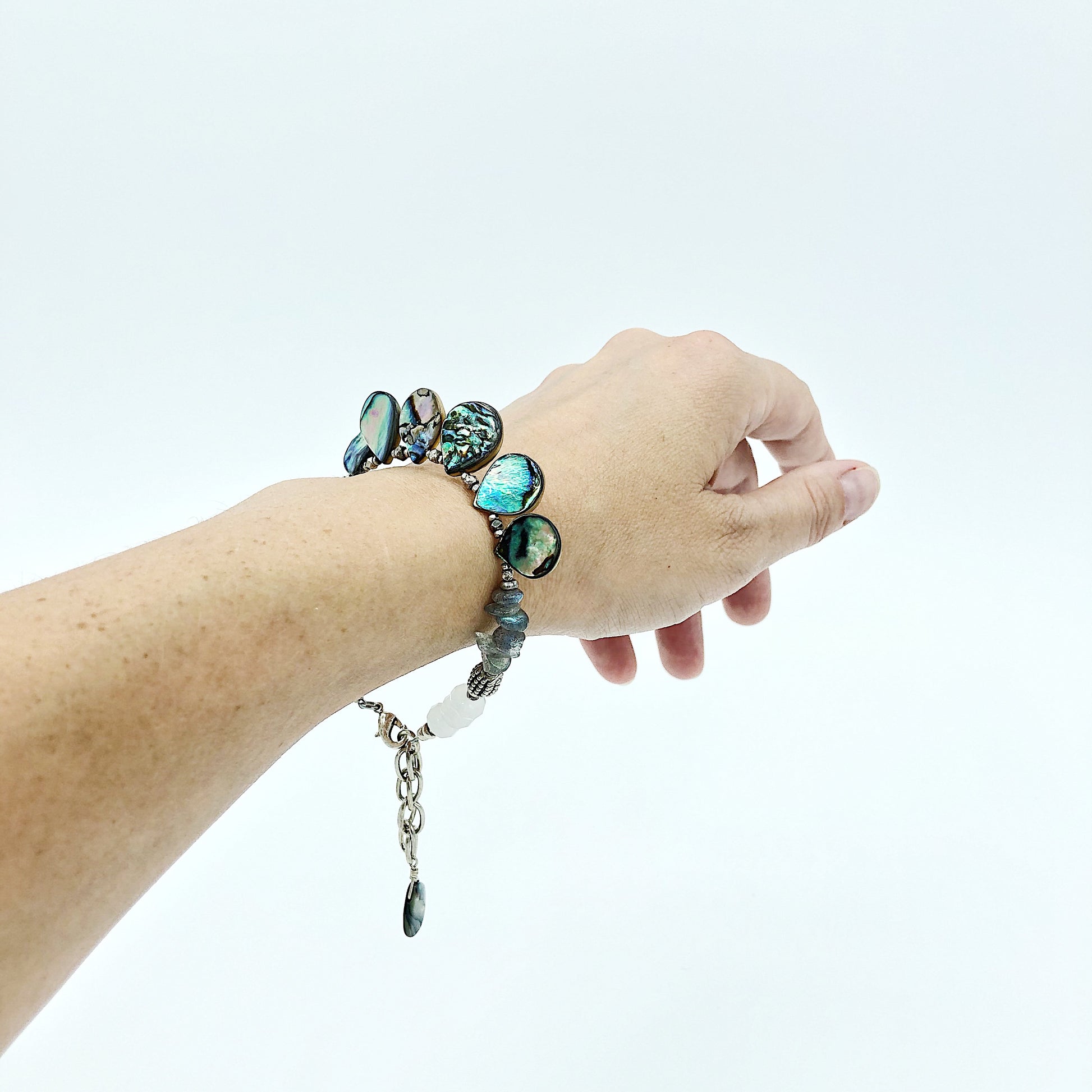 The Pavo Bracelet: Abalone, Labradorite, and Quartz met with silver plated chain create this adjustable and versatile bracelet.
