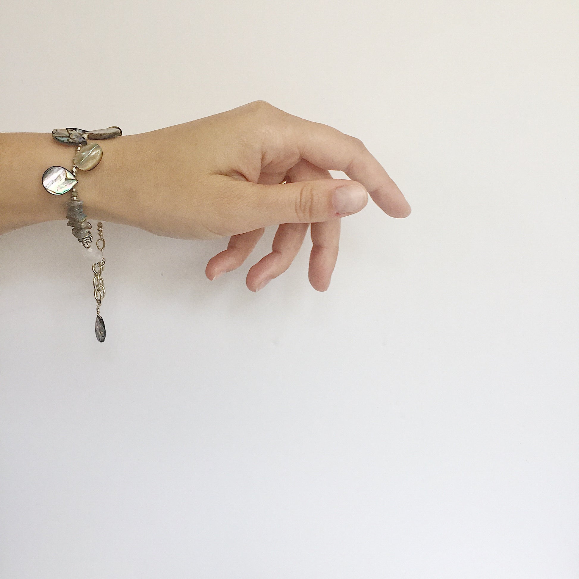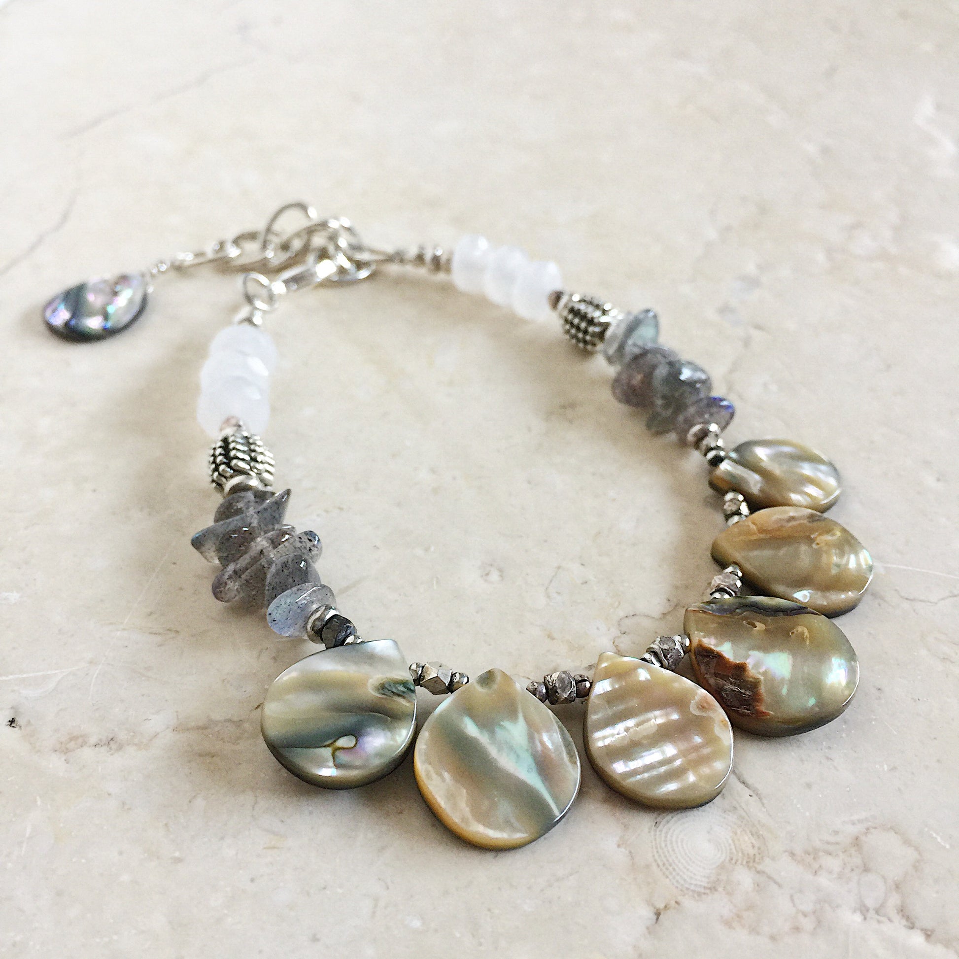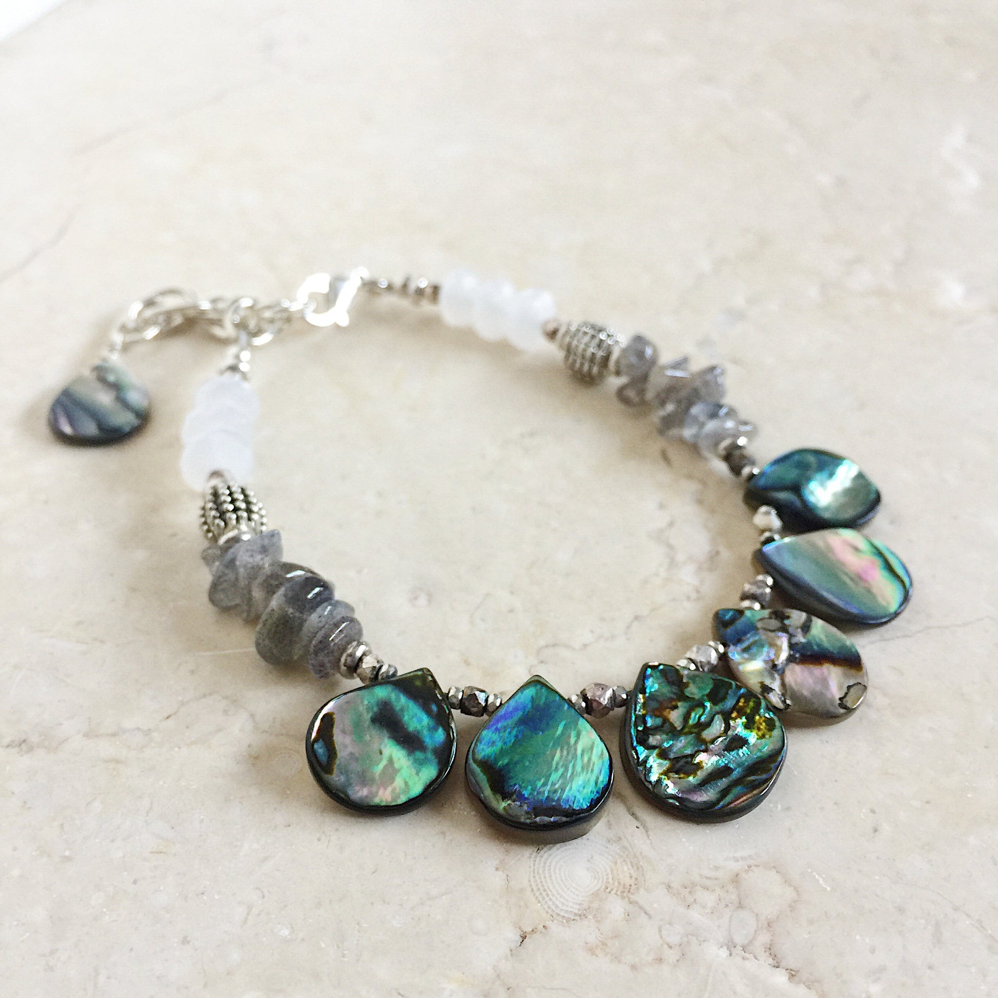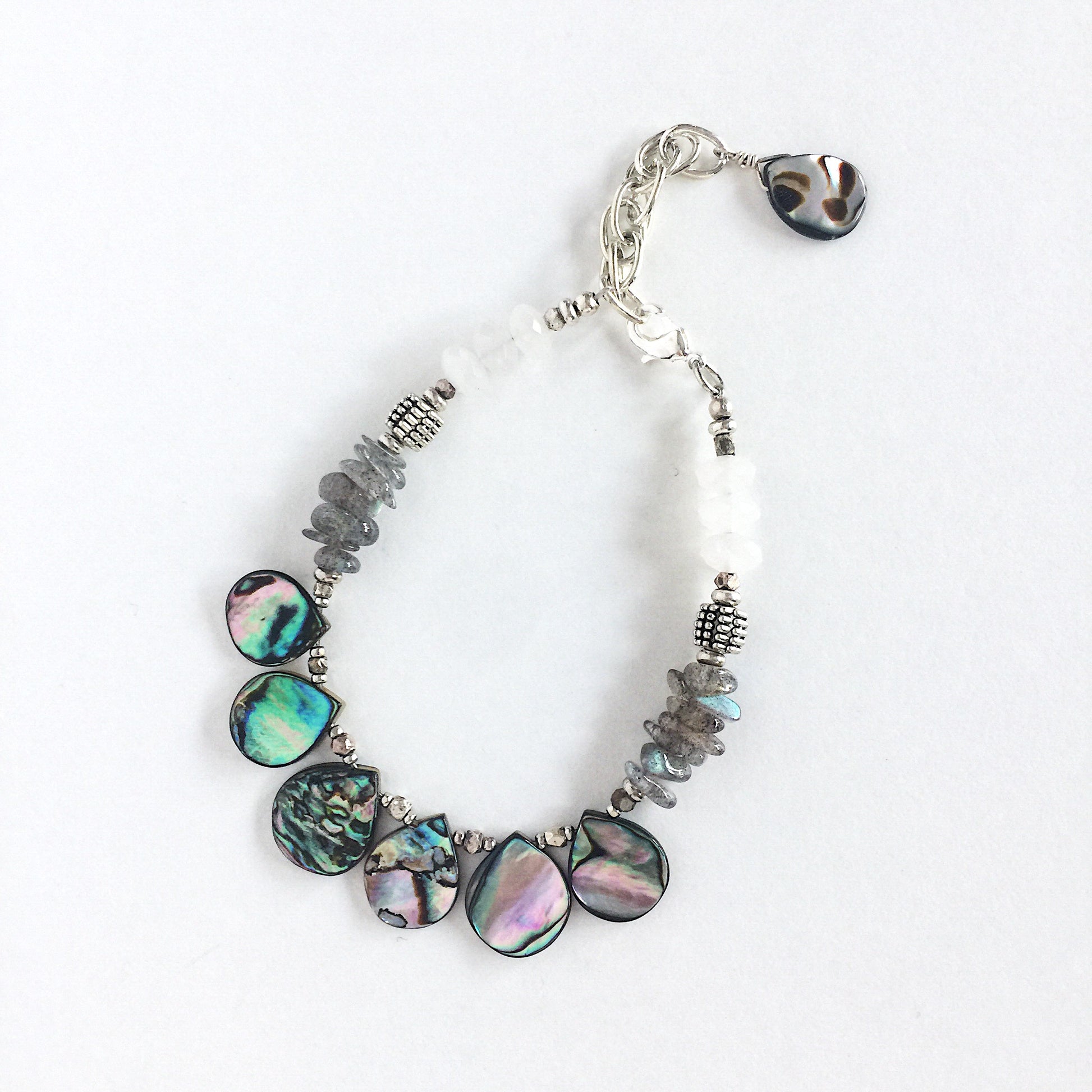 The Pavo Bracelet: Abalone, Labradorite, and Quartz met with silver plated chain create this adjustable and versatile bracelet.