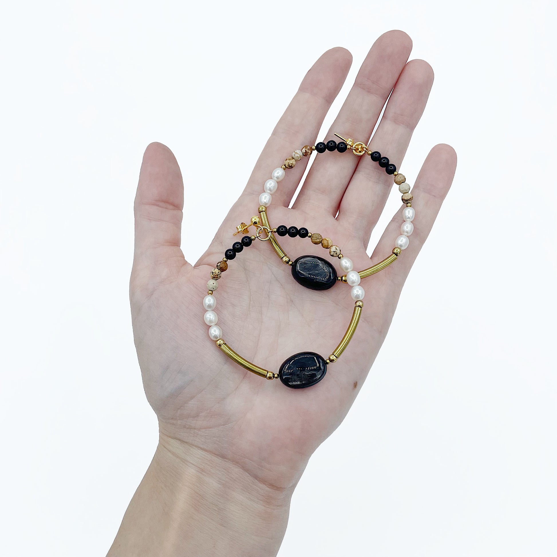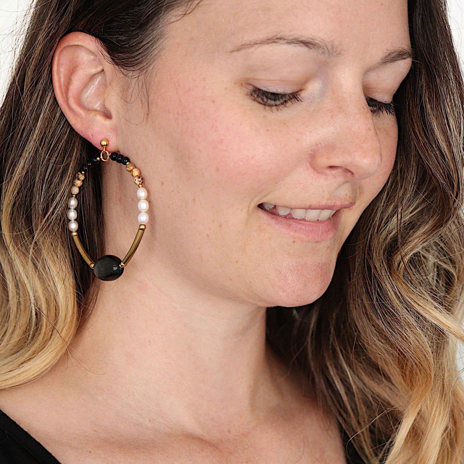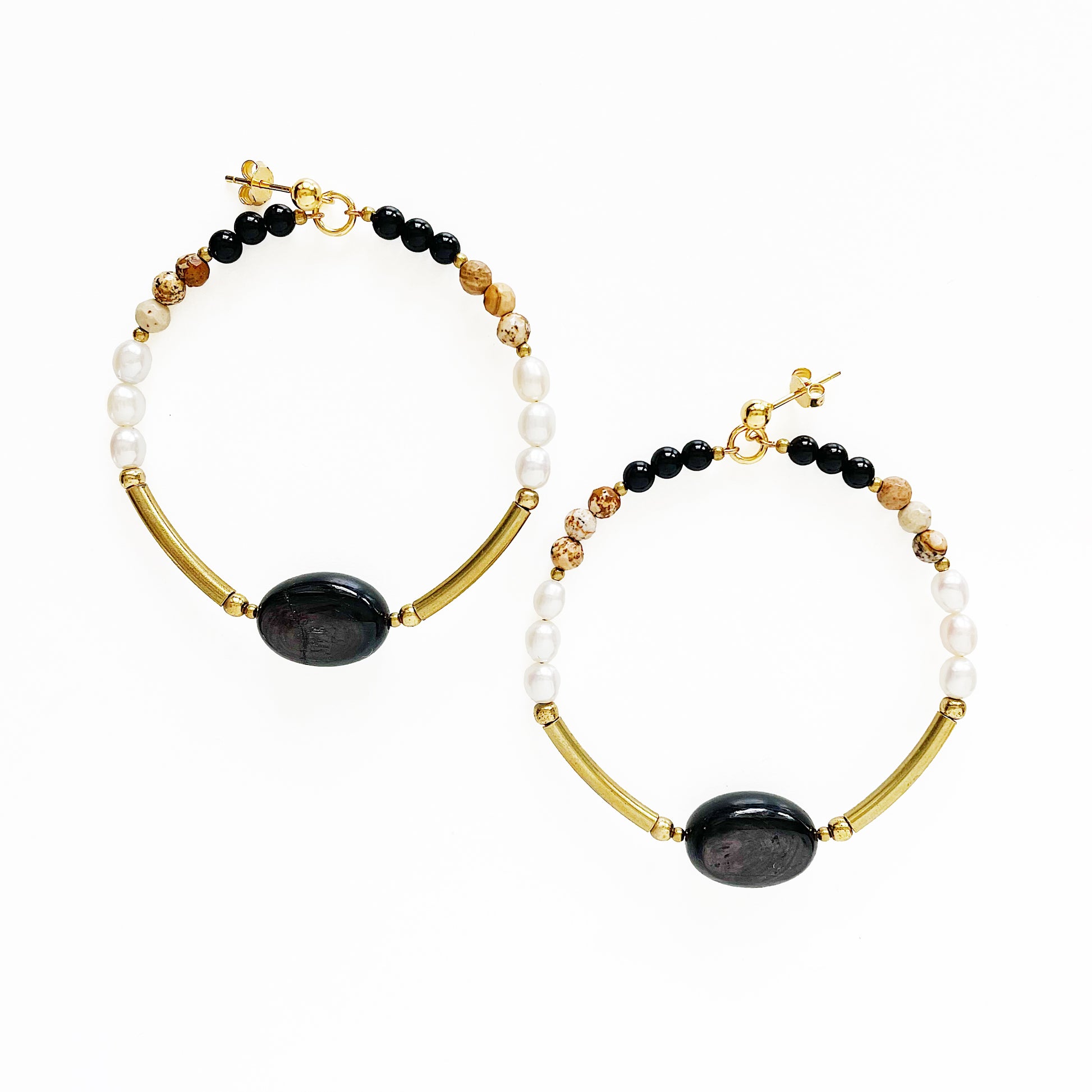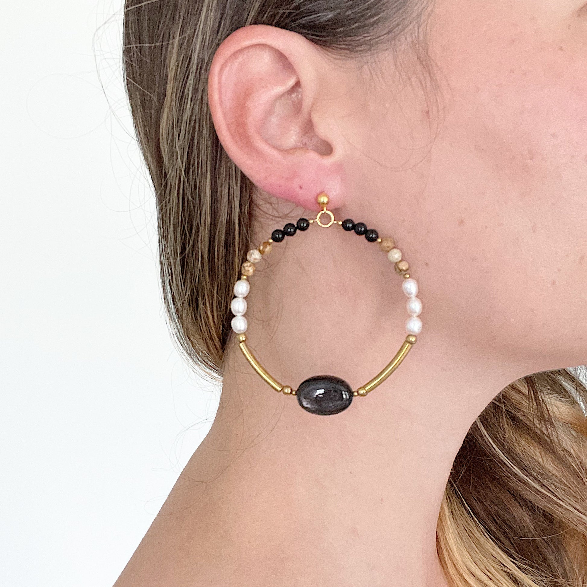 The Rhea Earrings: black obsidian, white fresh water pearls, tan picture jasper, black onyx, gold plated tube beads and vermeil ear studs create this neutral statement earring set.
