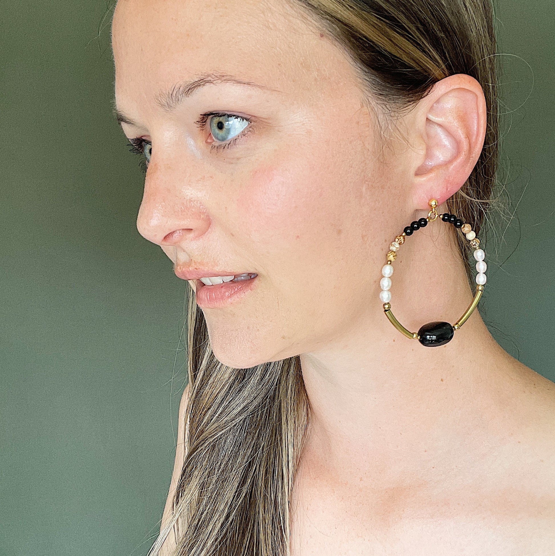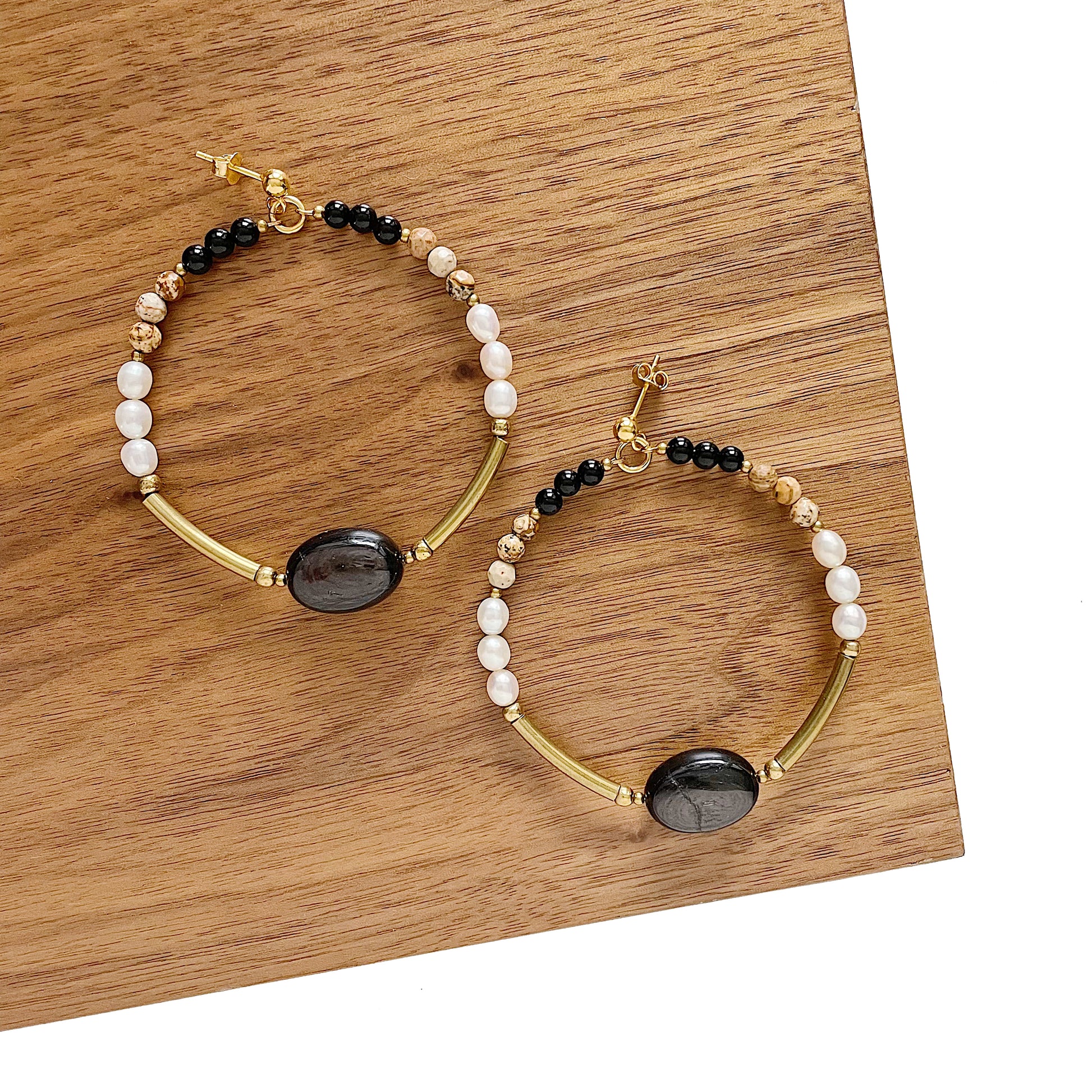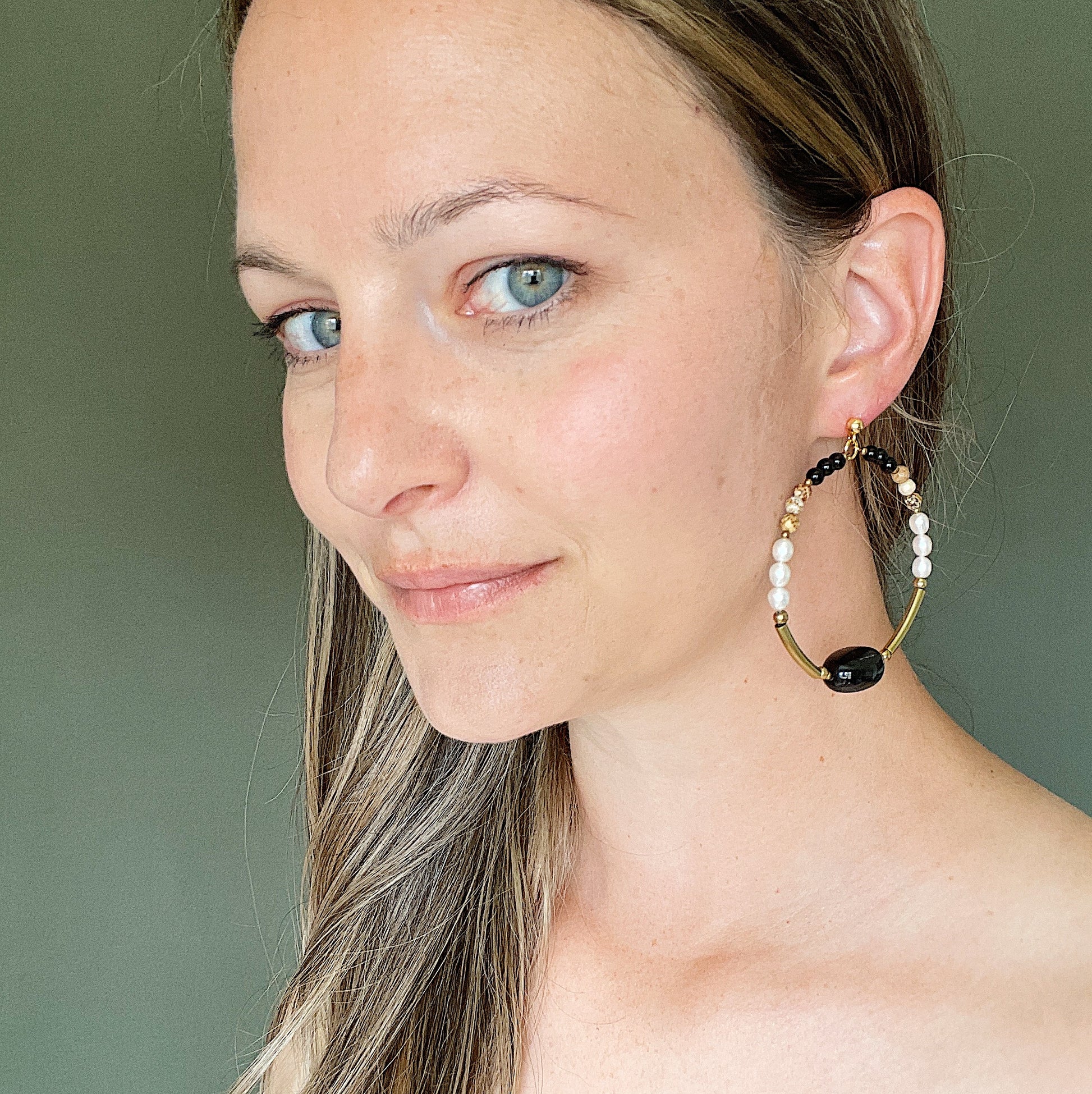 The Rhea Earrings: black obsidian, white fresh water pearls, tan picture jasper, black onyx, gold plated tube beads and vermeil ear studs create this neutral statement earring set.