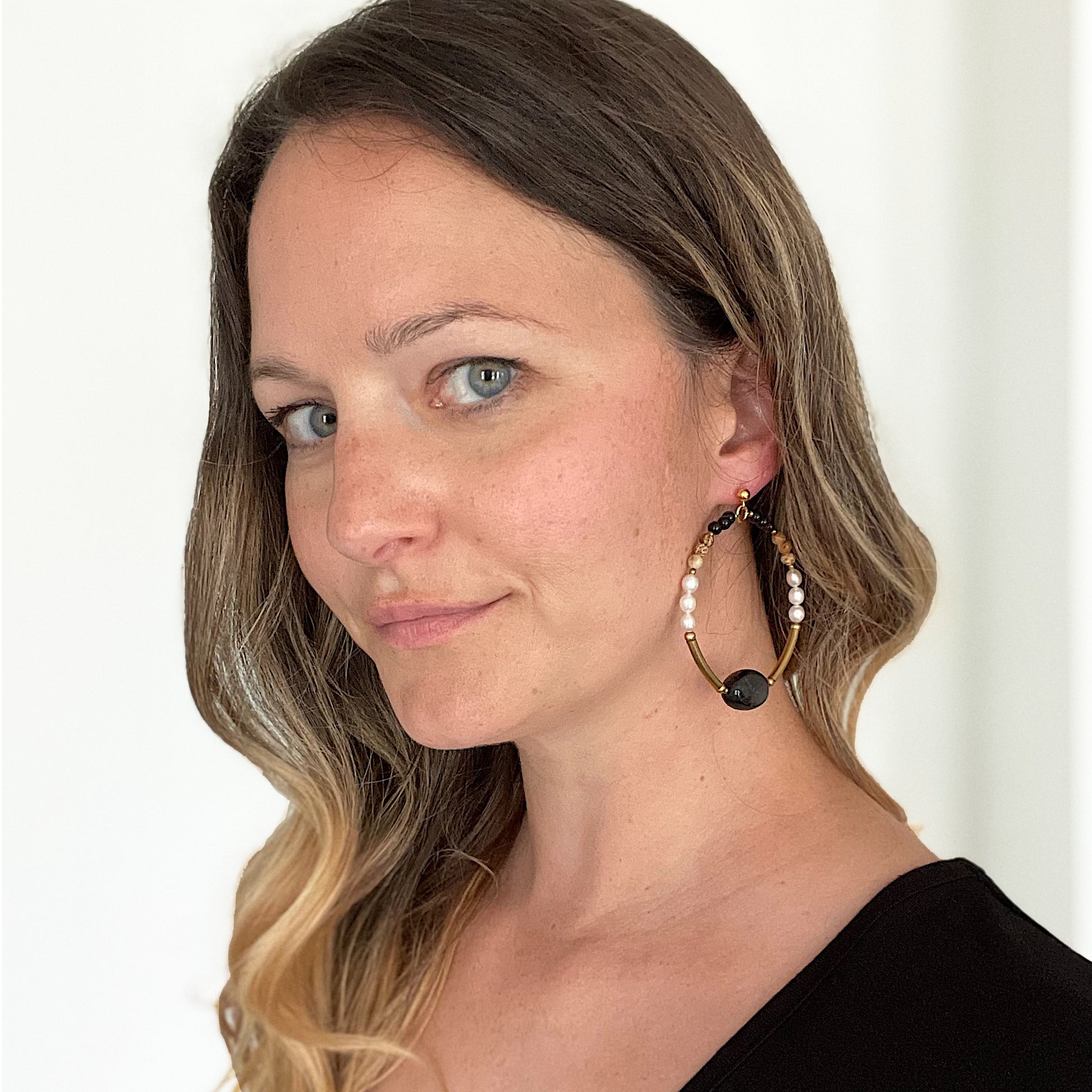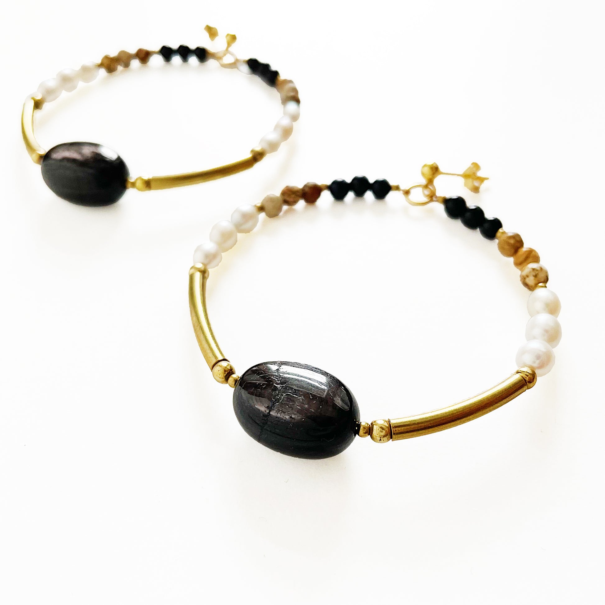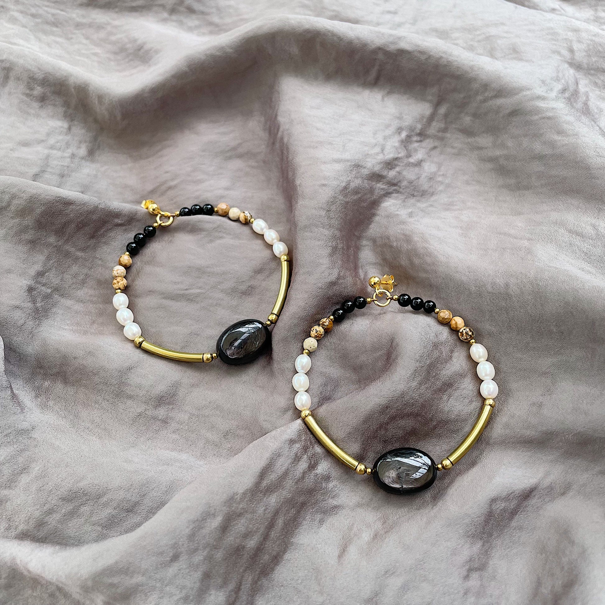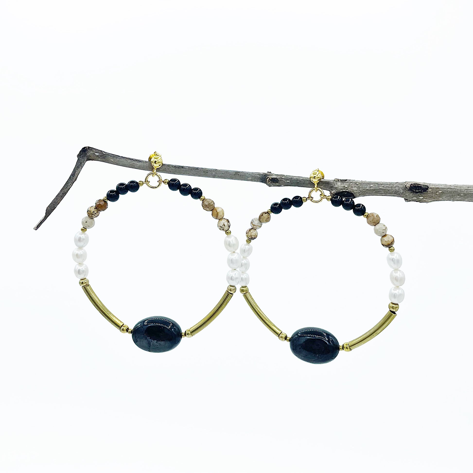 The Rhea Earrings: black obsidian, white fresh water pearls, tan picture jasper, black onyx, gold plated tube beads and vermeil ear studs create this neutral statement earring set.