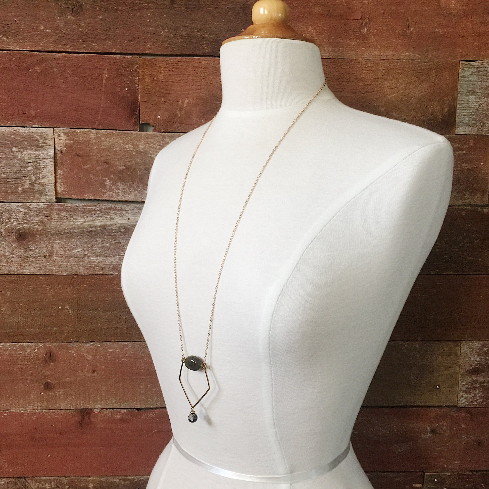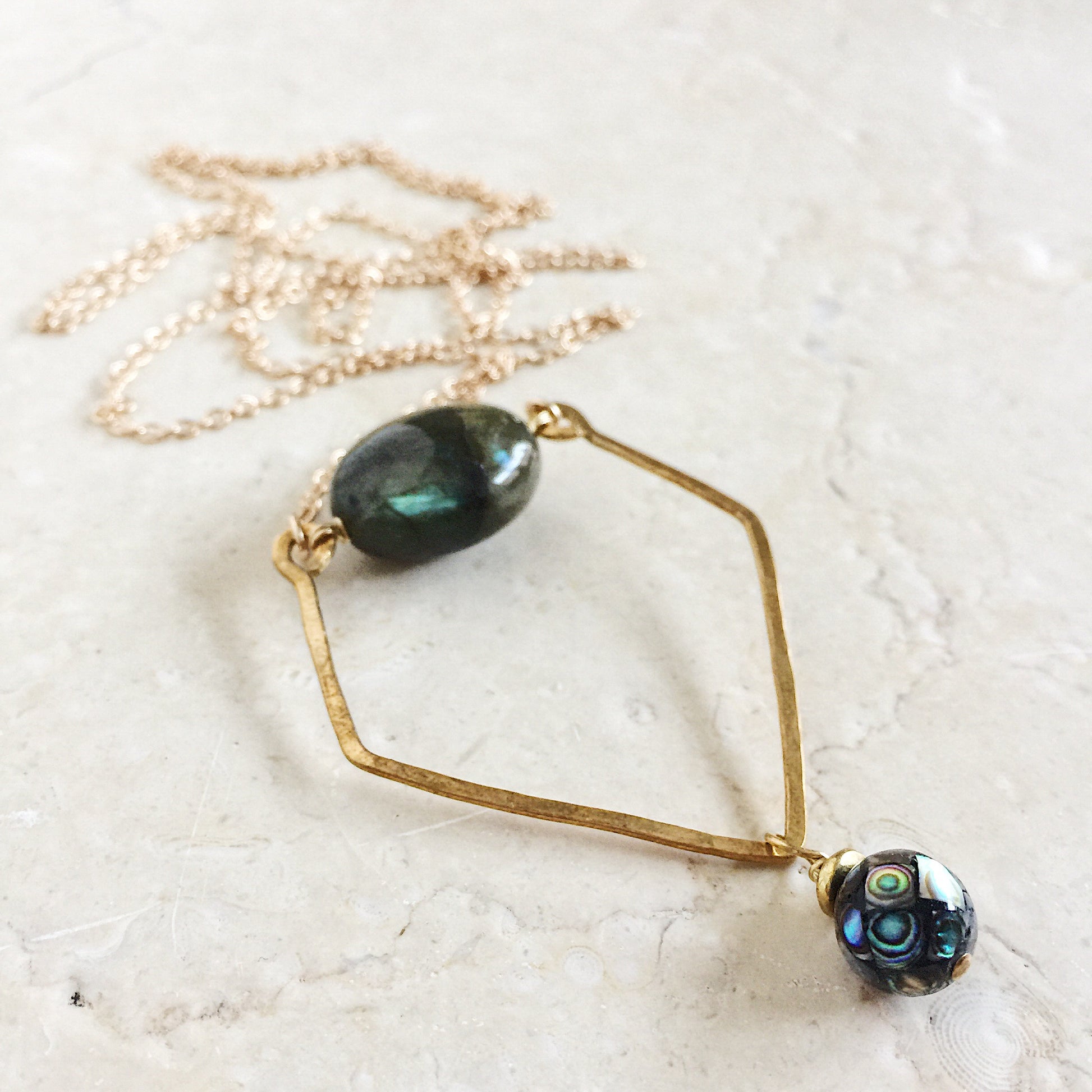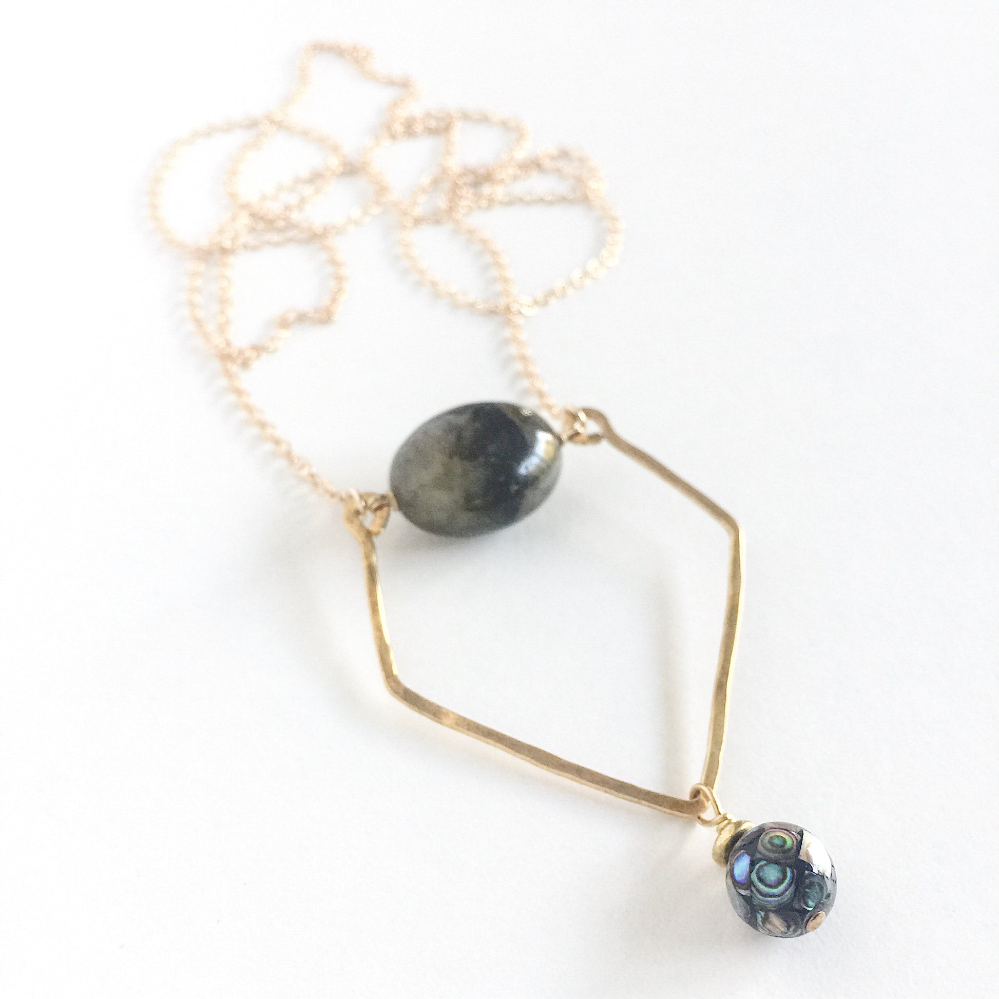 The Serpens Necklace: a single Labradorite oval met with a hand hewn brass bead frame, a small abalone "disco" ball and gold plated chain create this simple and versatile necklace.