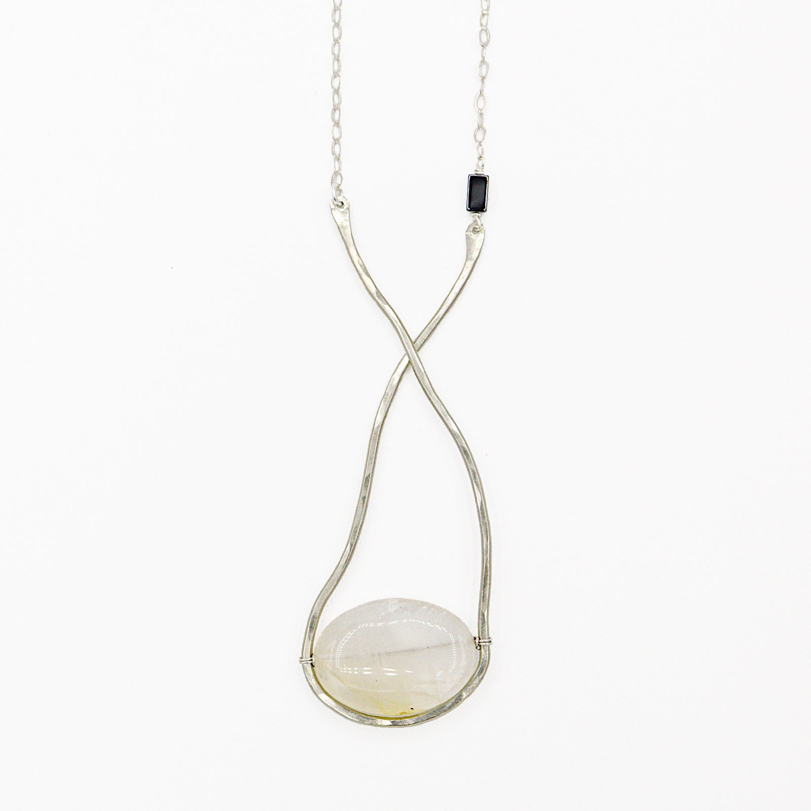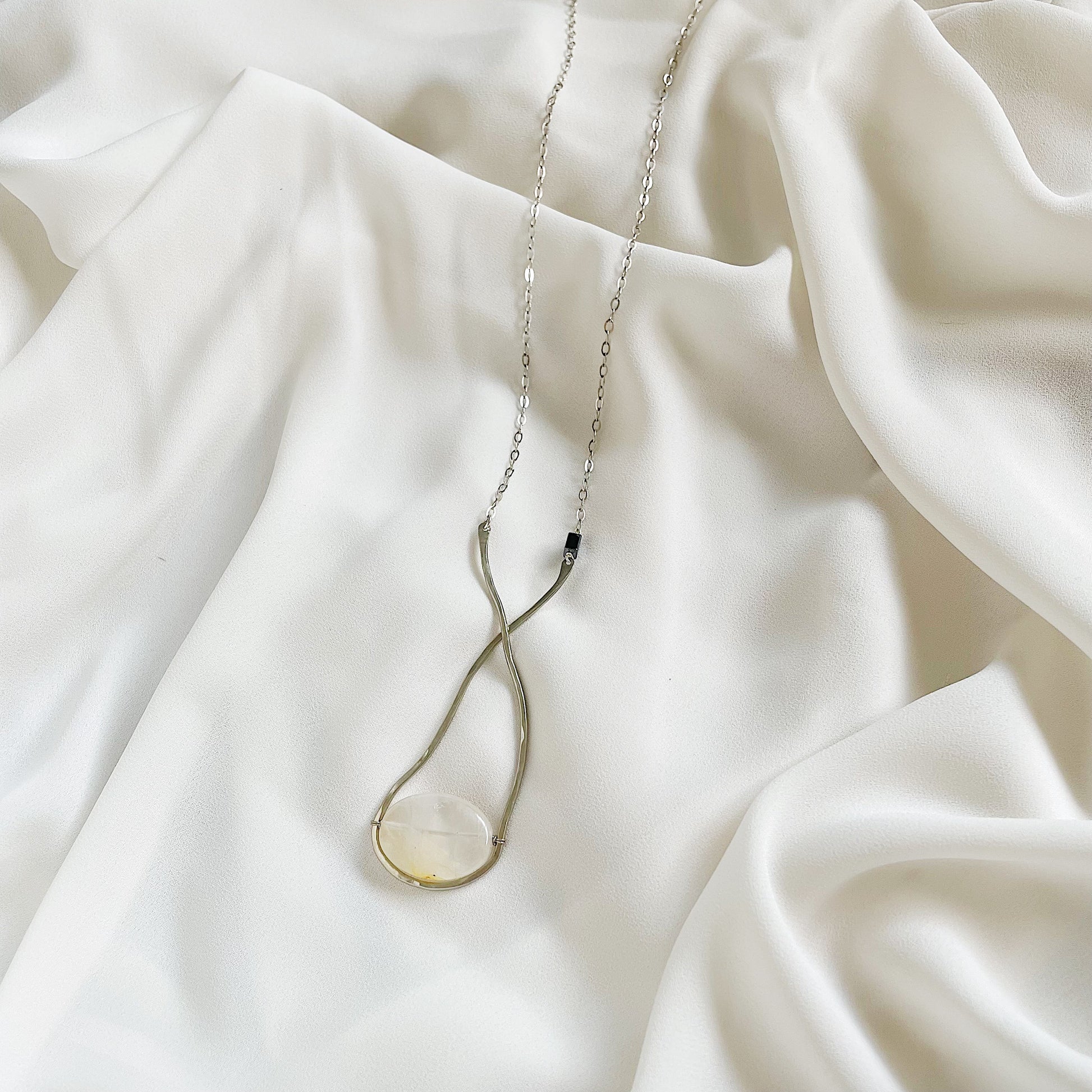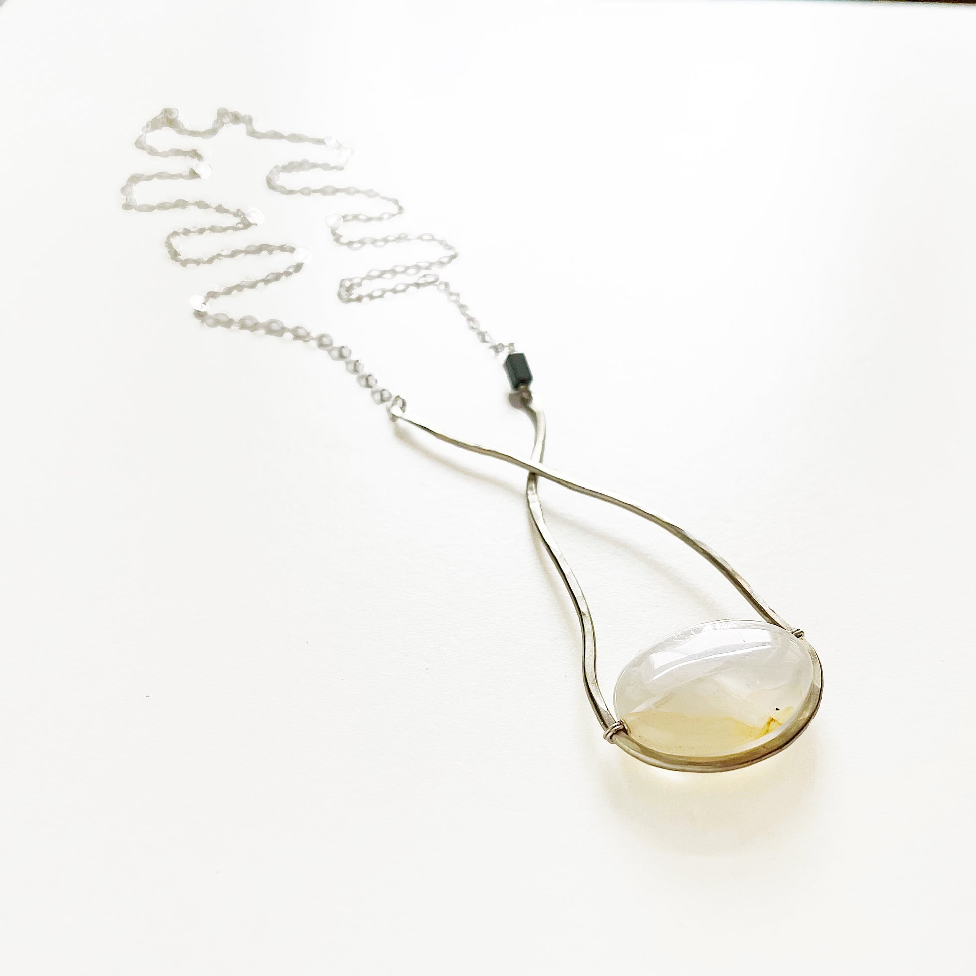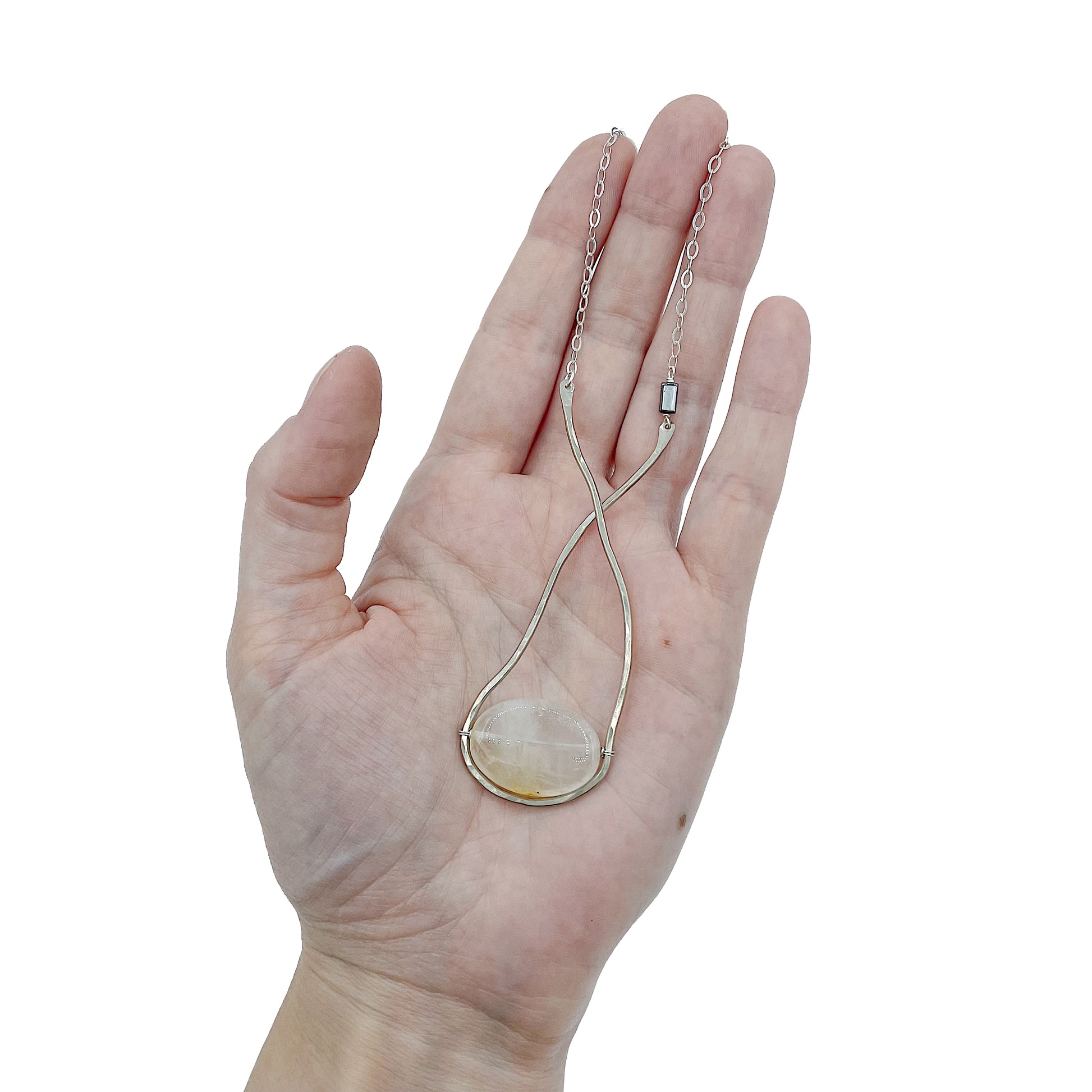 The Sinope Necklace: clear/tan/orange citrine with hematite, organic hammered freeform shape in German silver met with sterling silver chain, create this neutral statement piece.