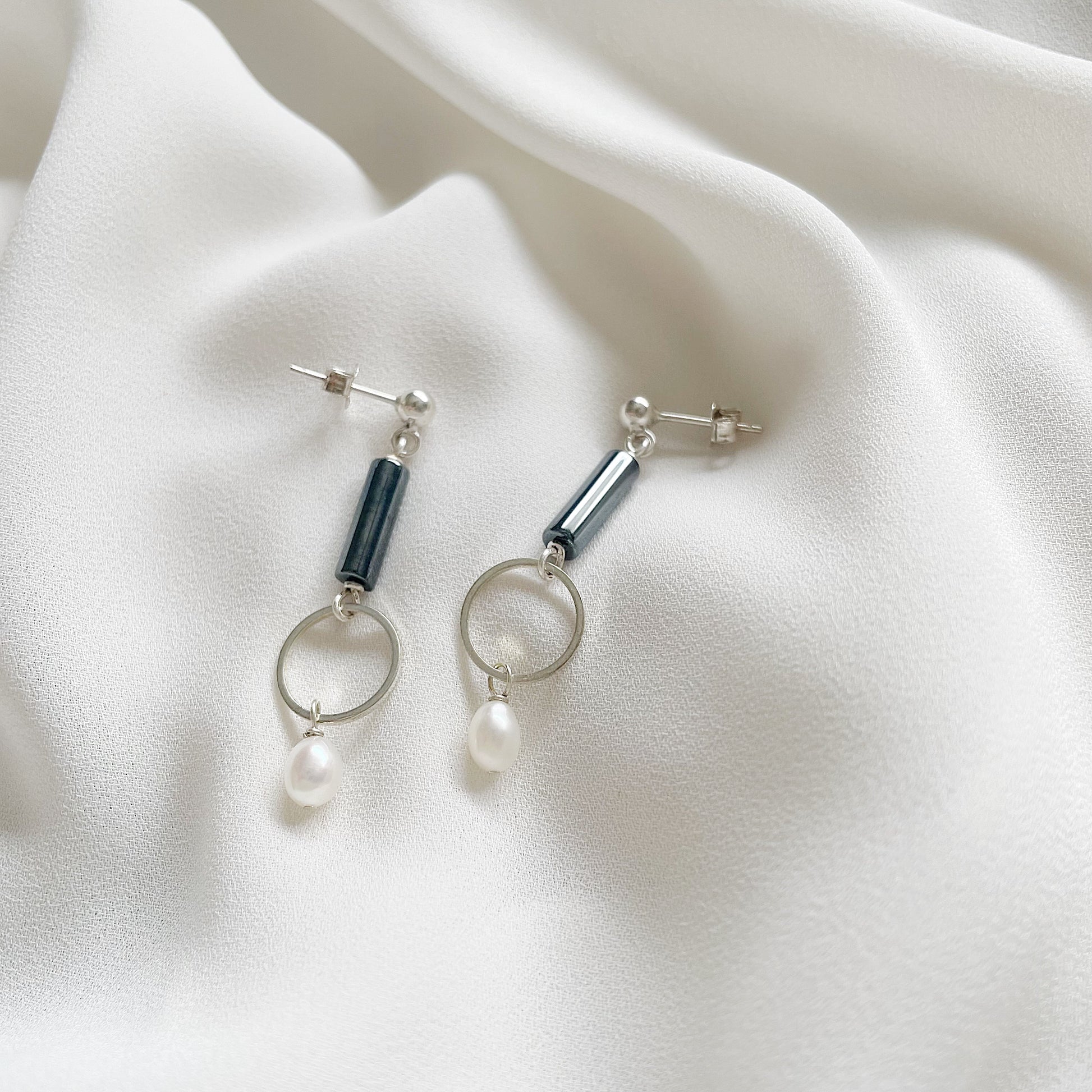 The Soren Earrings; gunmetal hematite, white fresh water pearls, silver-plated open circles and sterling silver ear studs create this neutral statement earring set.
