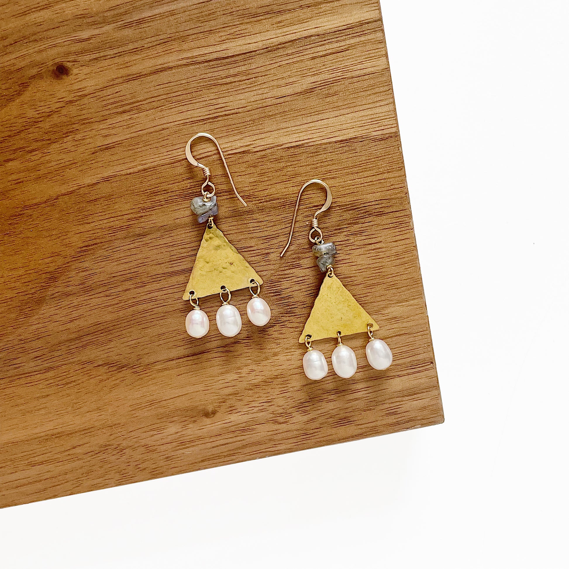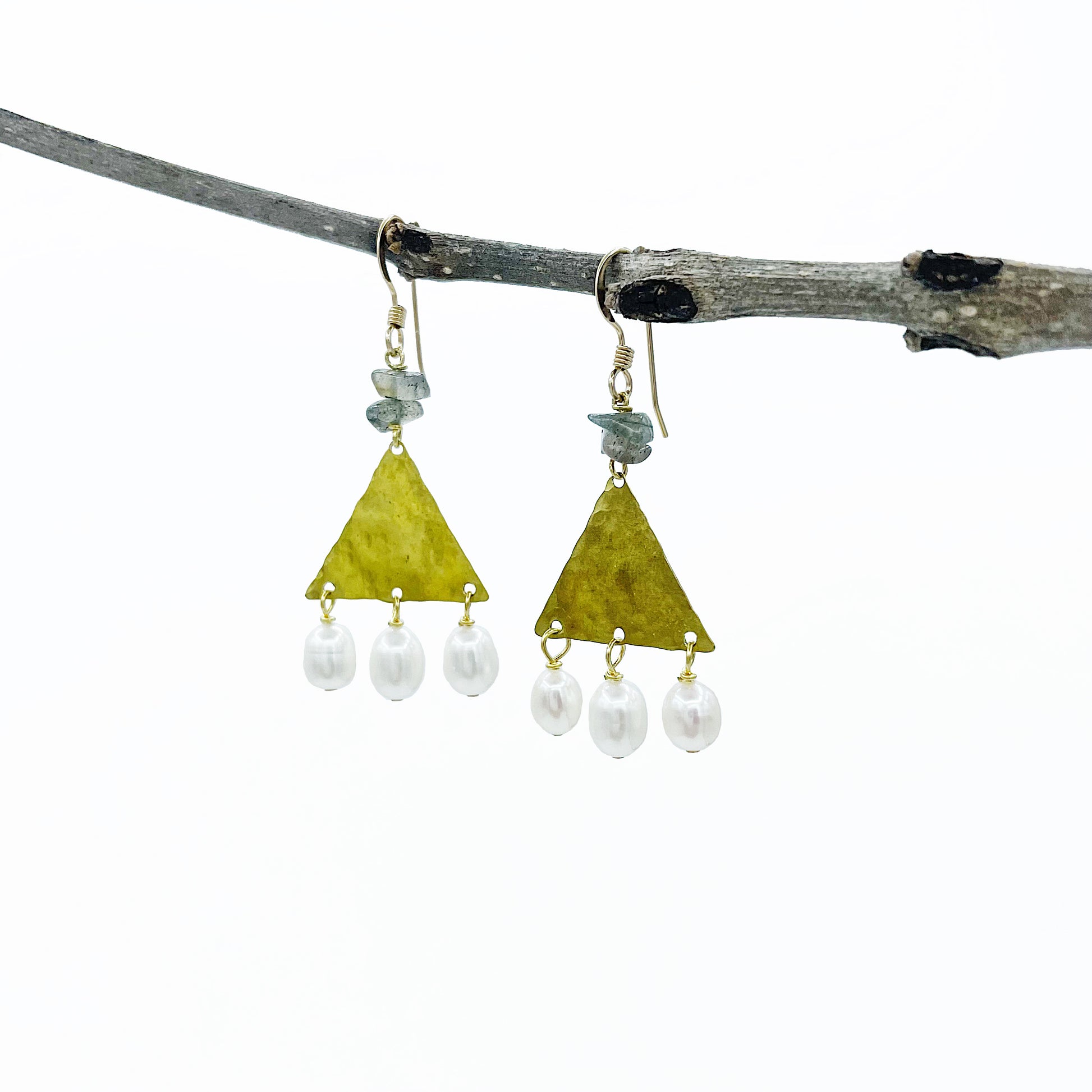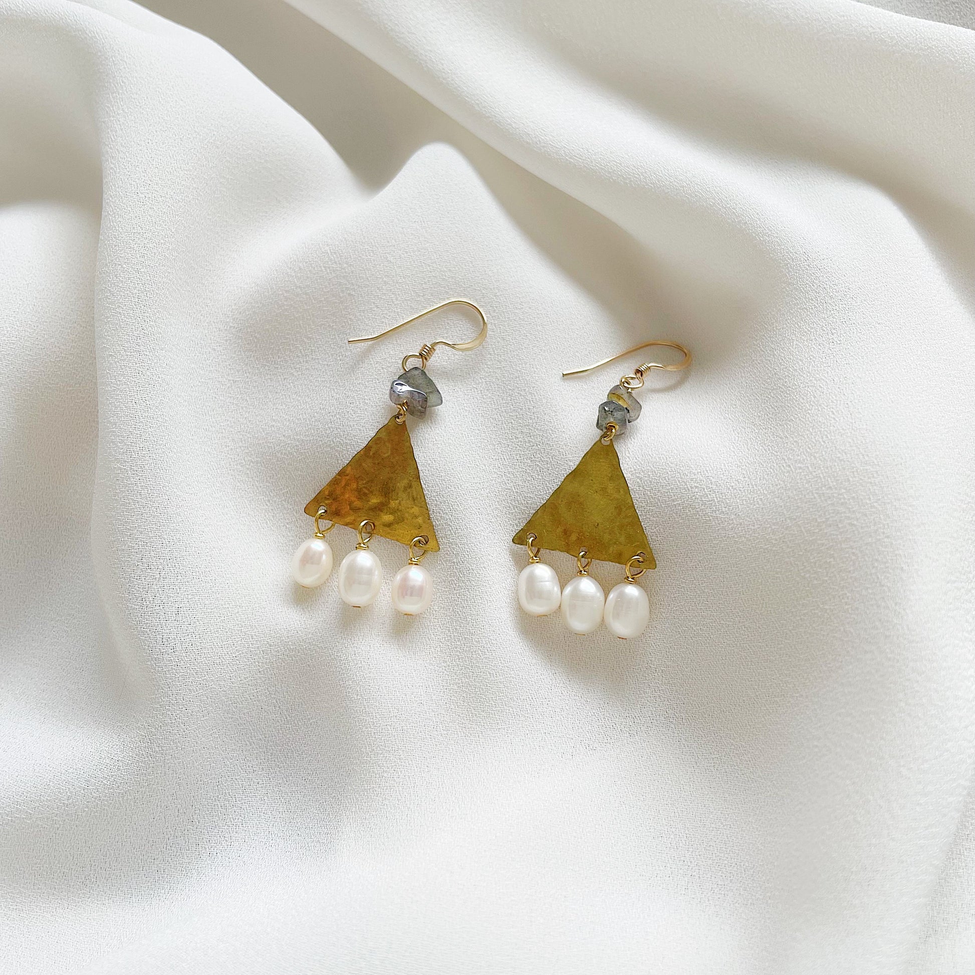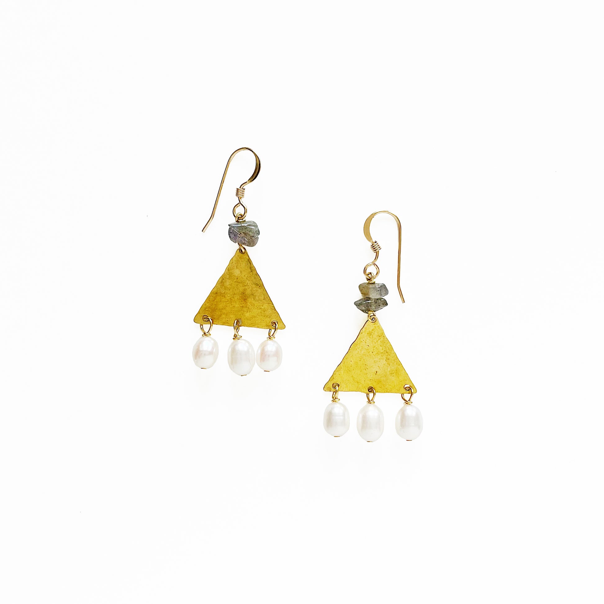 The Thebe Earrings; white fresh water pearl, blue/green/gray labradorite chips, hammered brass triangles and 14k gold fill ear wires create this neutral, geometric statement earring set.