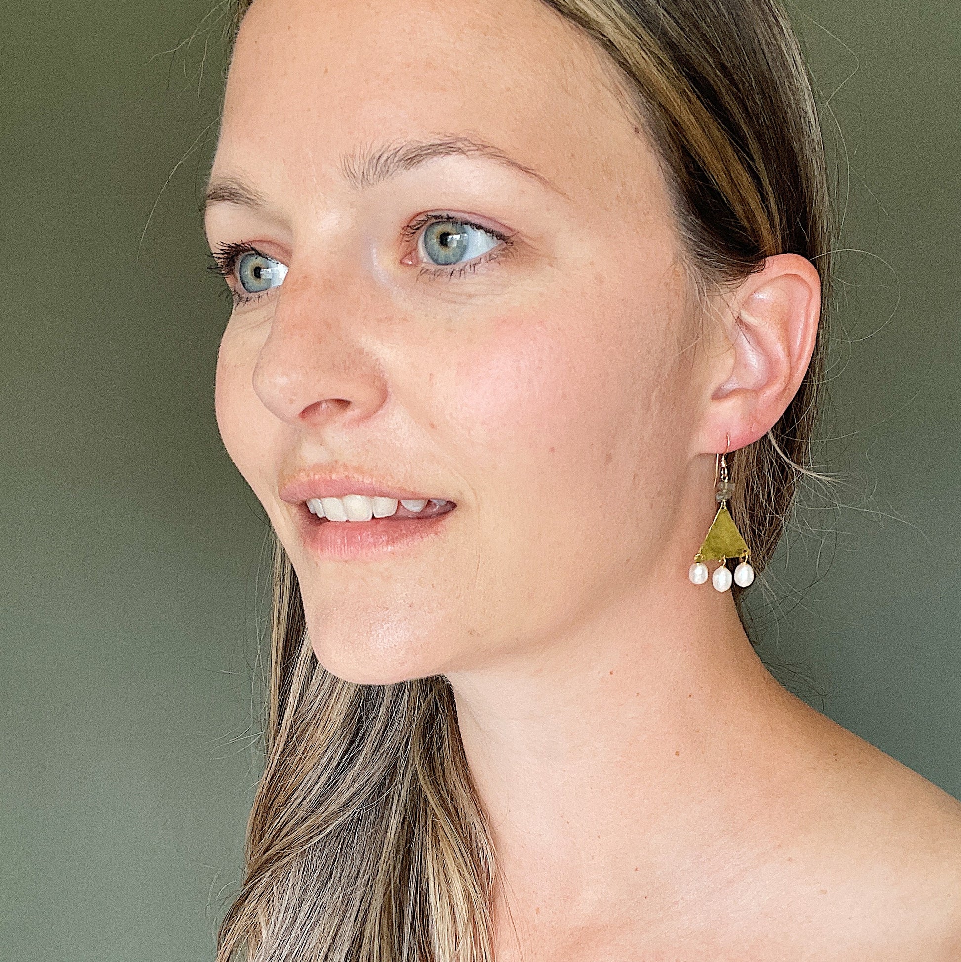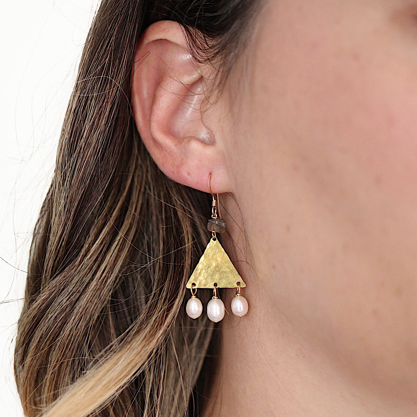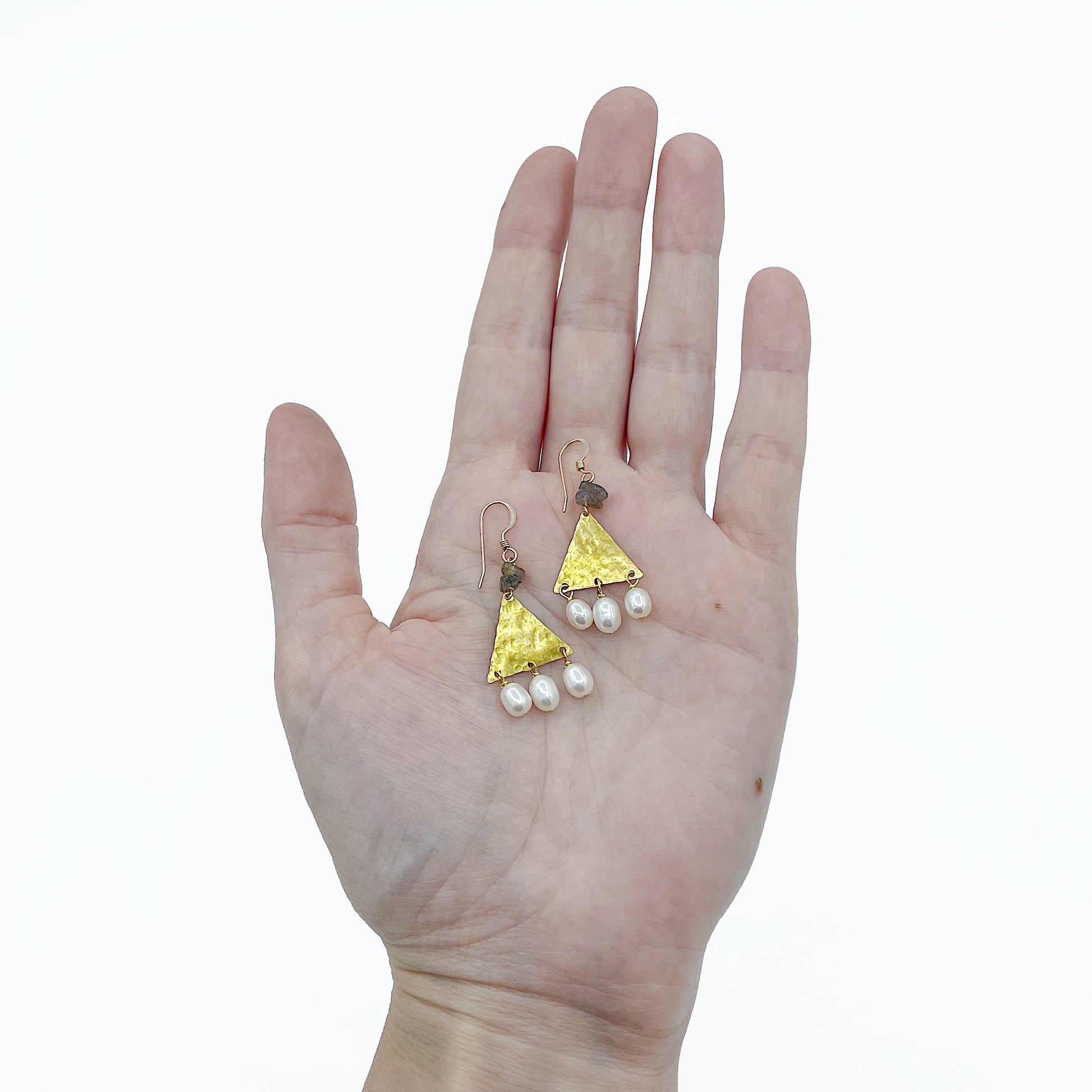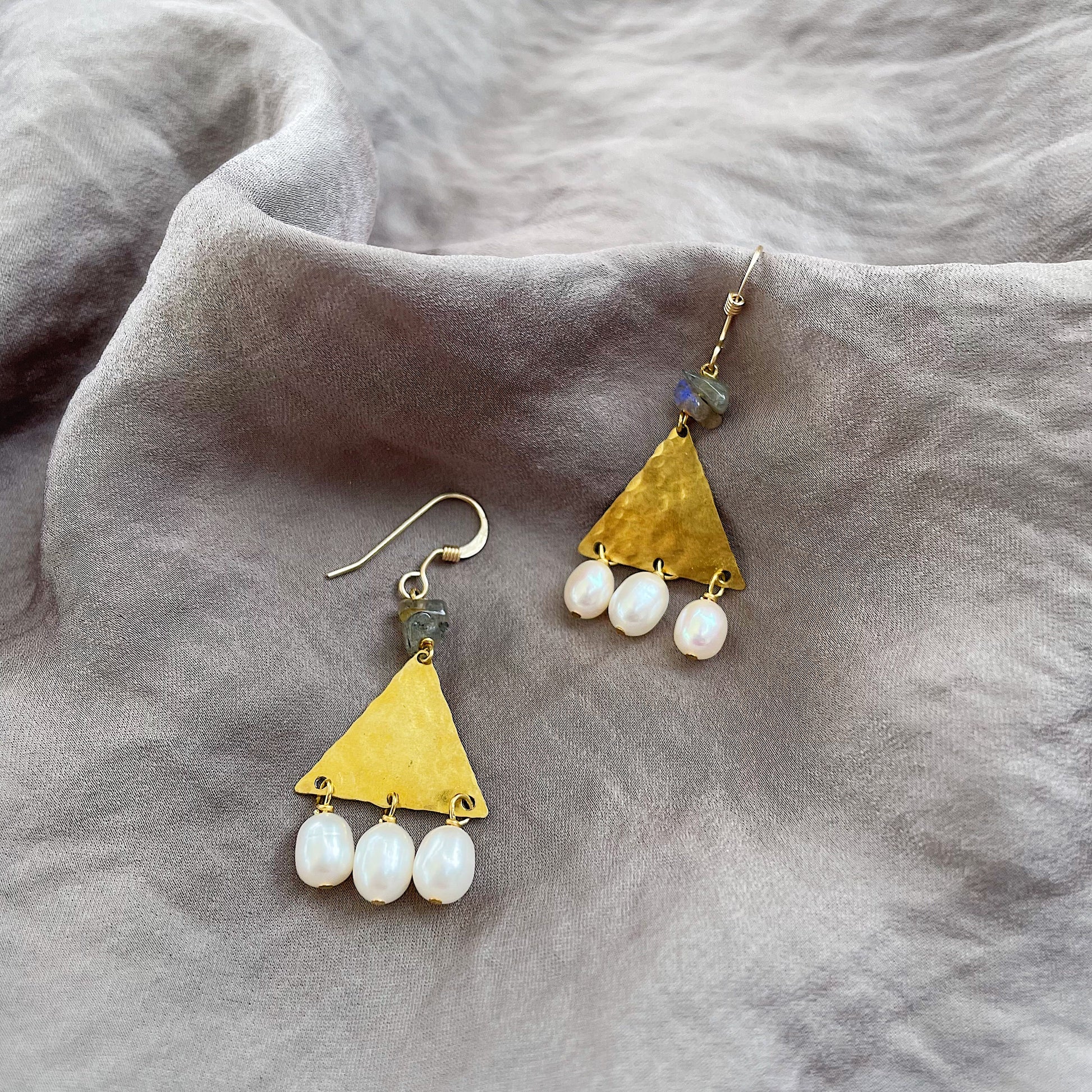 The Thebe Earrings; white fresh water pearl, blue/green/gray labradorite chips, hammered brass triangles and 14k gold fill ear wires create this neutral, geometric statement earring set.