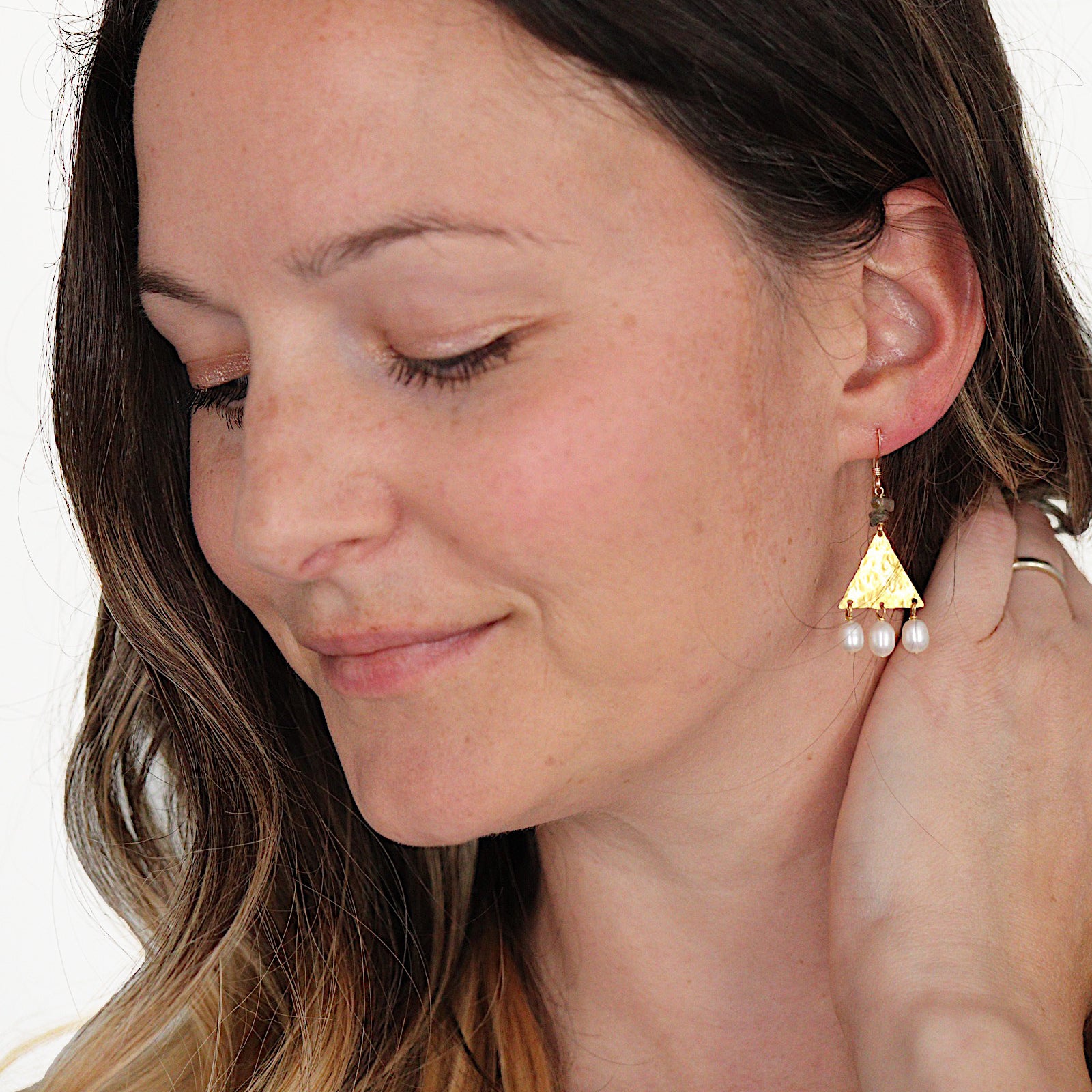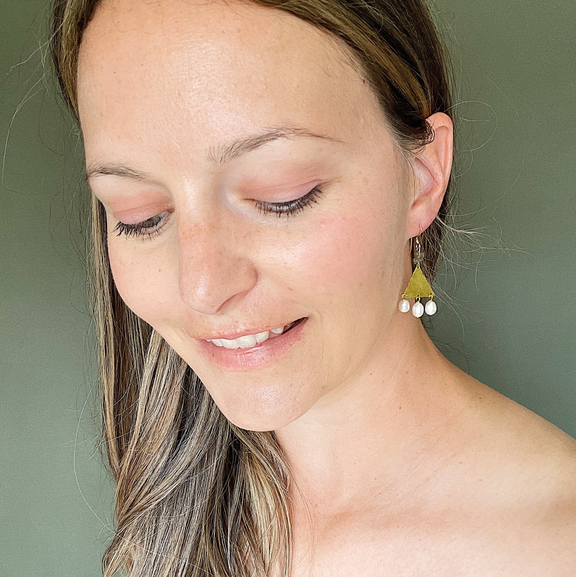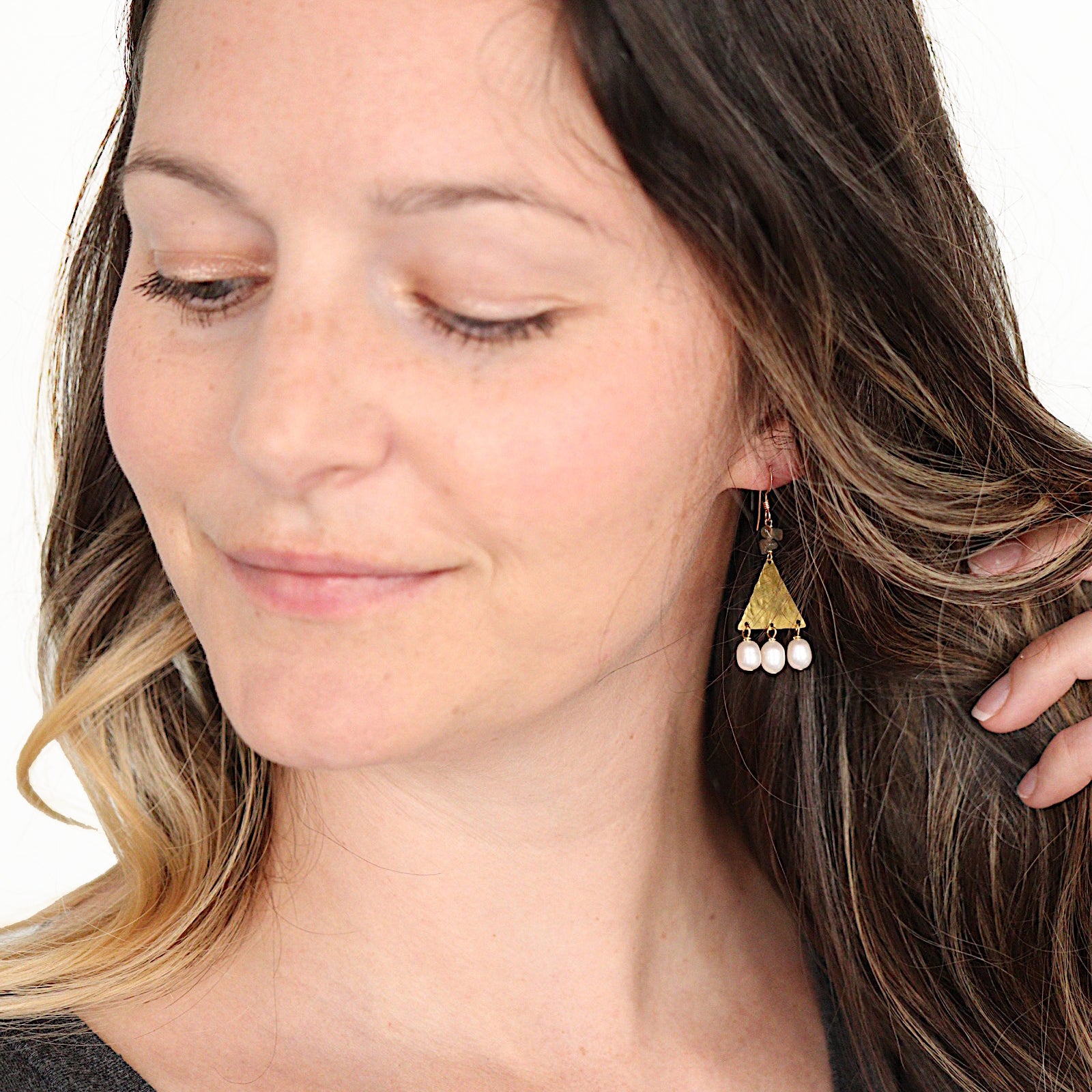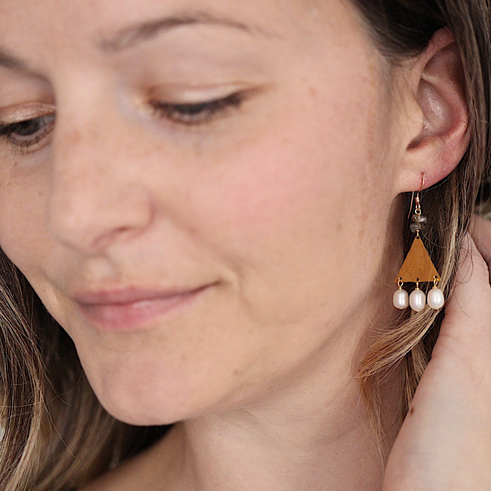 The Thebe Earrings; white fresh water pearl, blue/green/gray labradorite chips, hammered brass triangles and 14k gold fill ear wires create this neutral, geometric statement earring set.