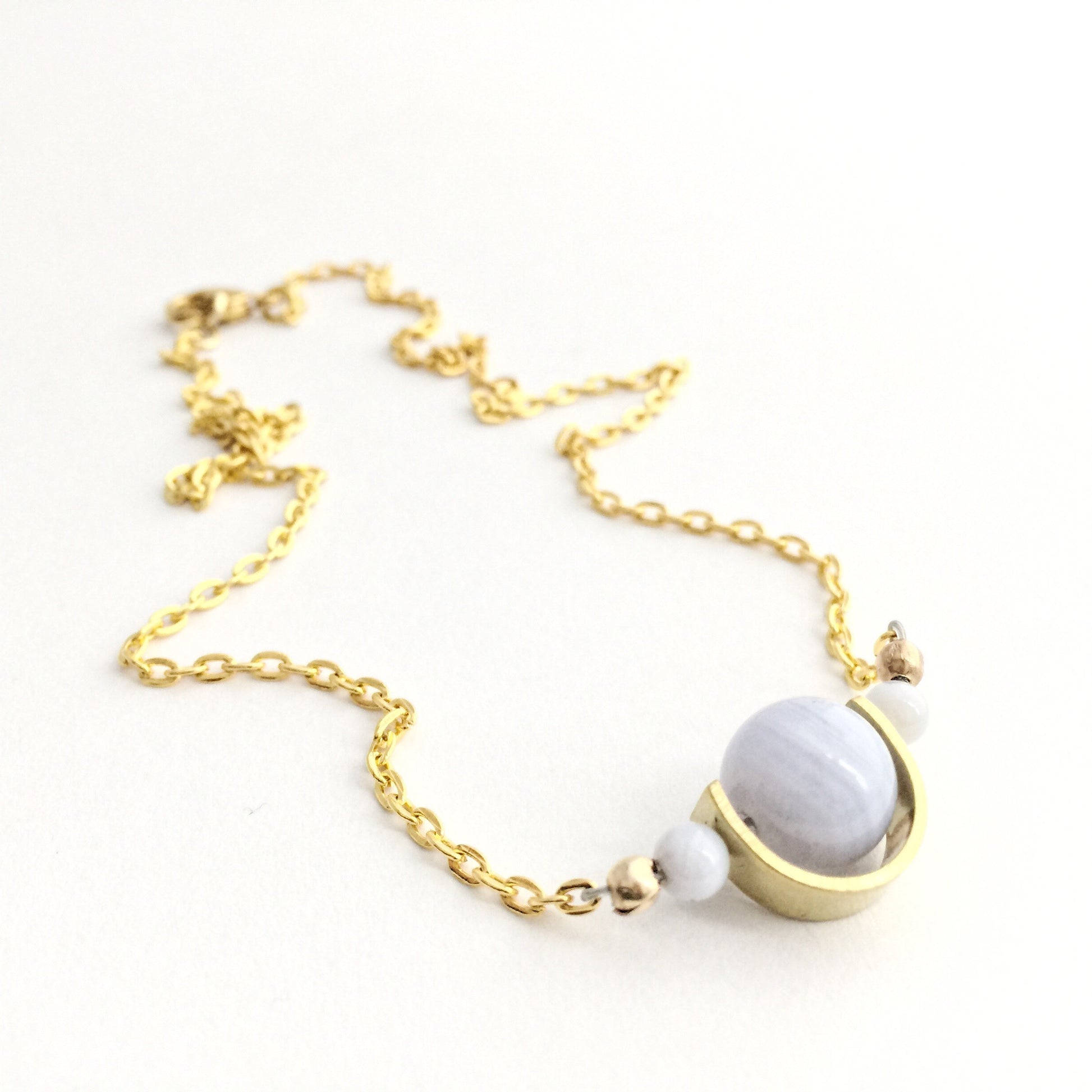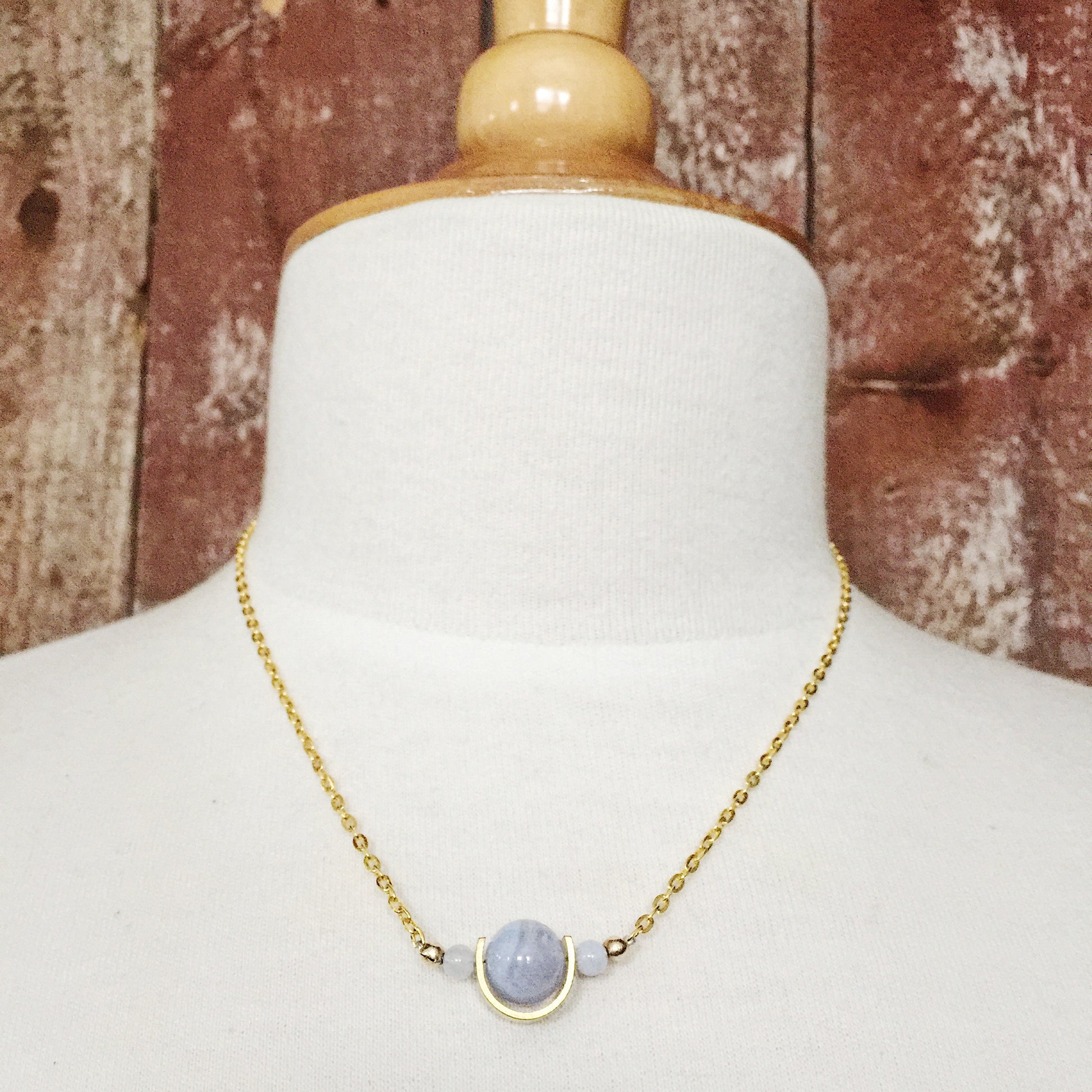 Three small orbs of Chalcedony combined with a U-shaped brass accent can perhaps remind the wearer of planets and moons in our solar system. This design is available in both a bright gold-plated open link style chain as well as an antiqued silver-plated open link style chain, both with lobster claw-style clasps.
