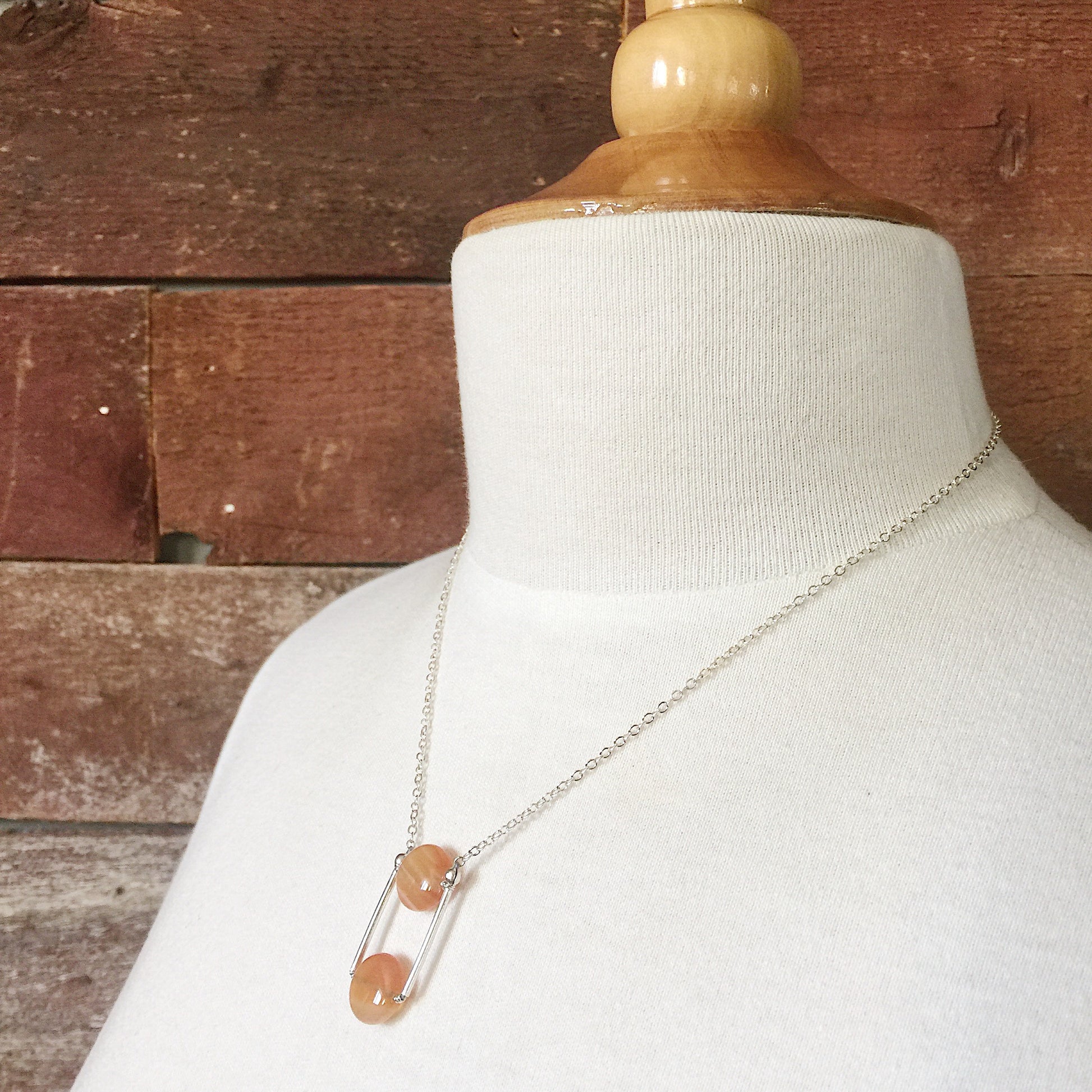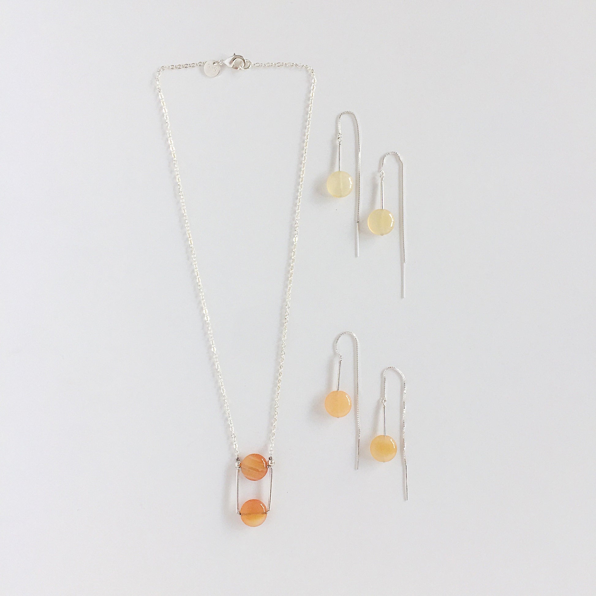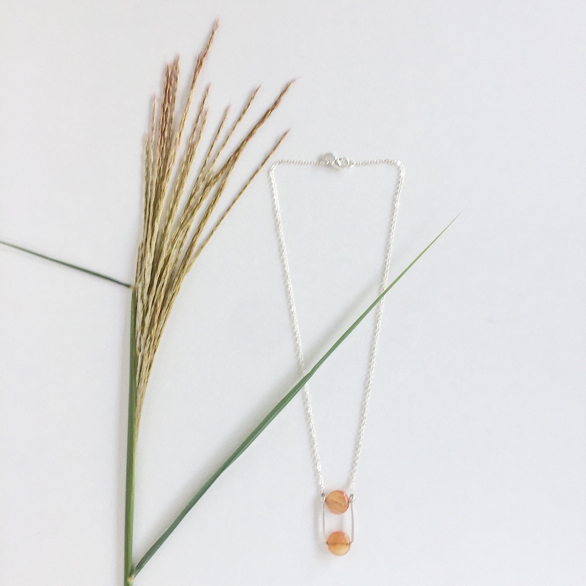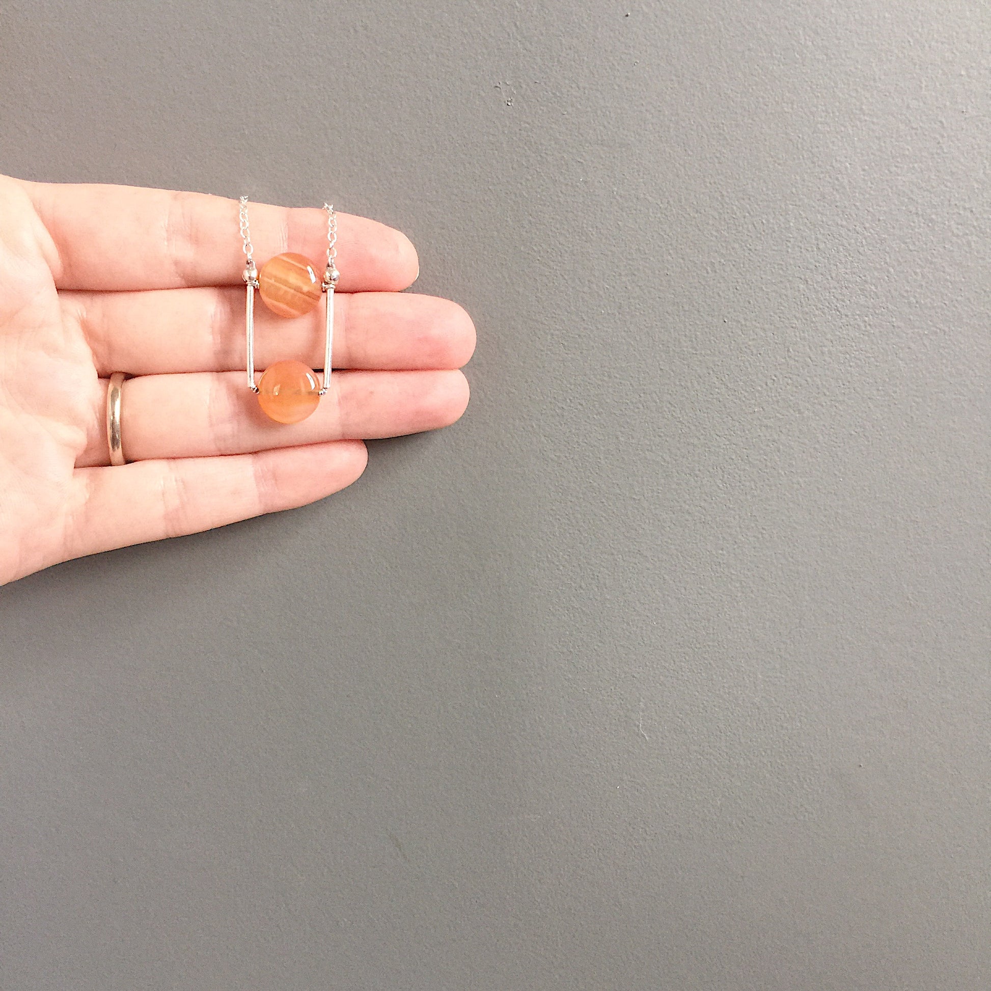 The Ursa Necklace: two flat round Carnelian stones met with two vintage Sterling Silver tube beads, and Sterling Silver chain create this minimalist and lightweight necklace. Coordinates with the Ursa Earrings.
