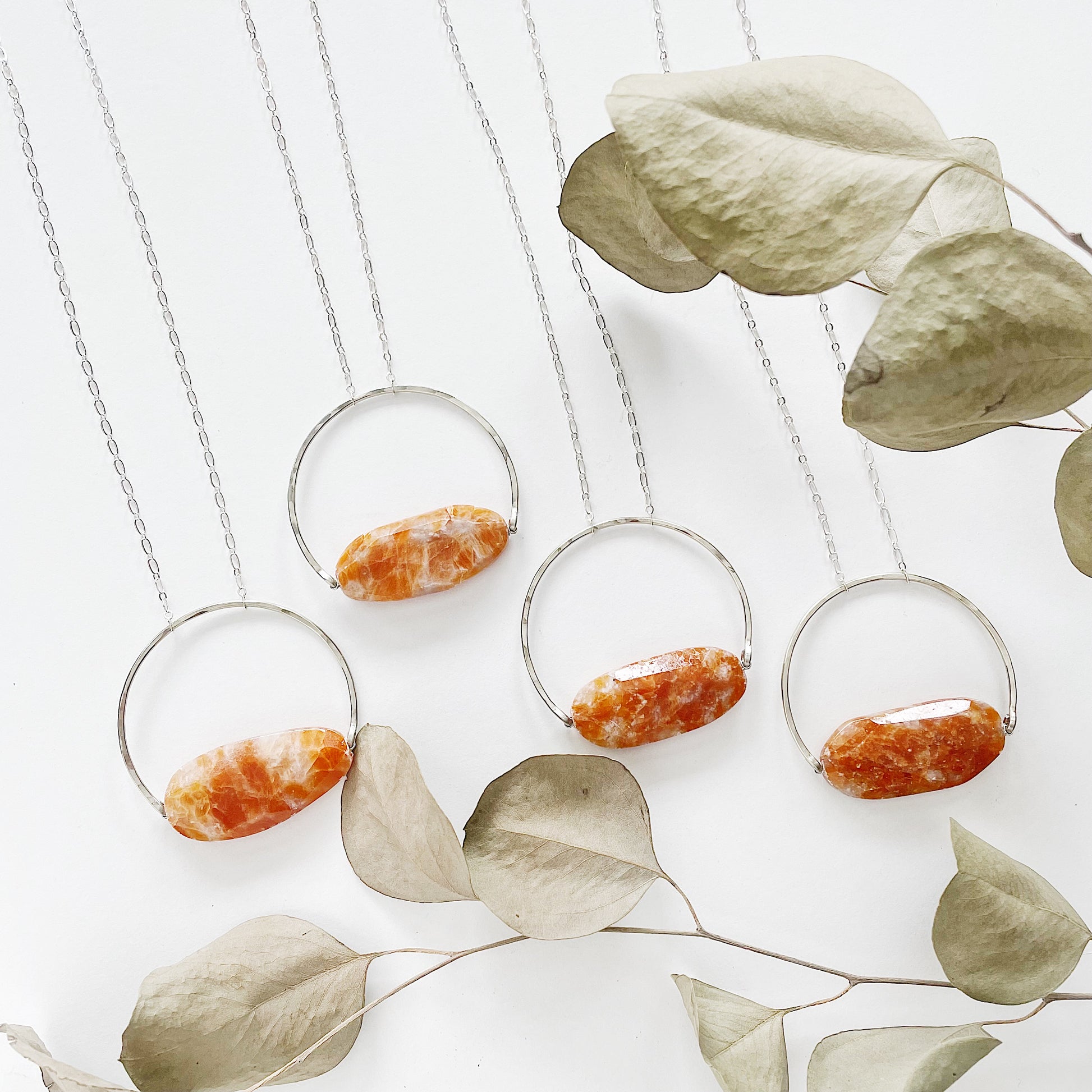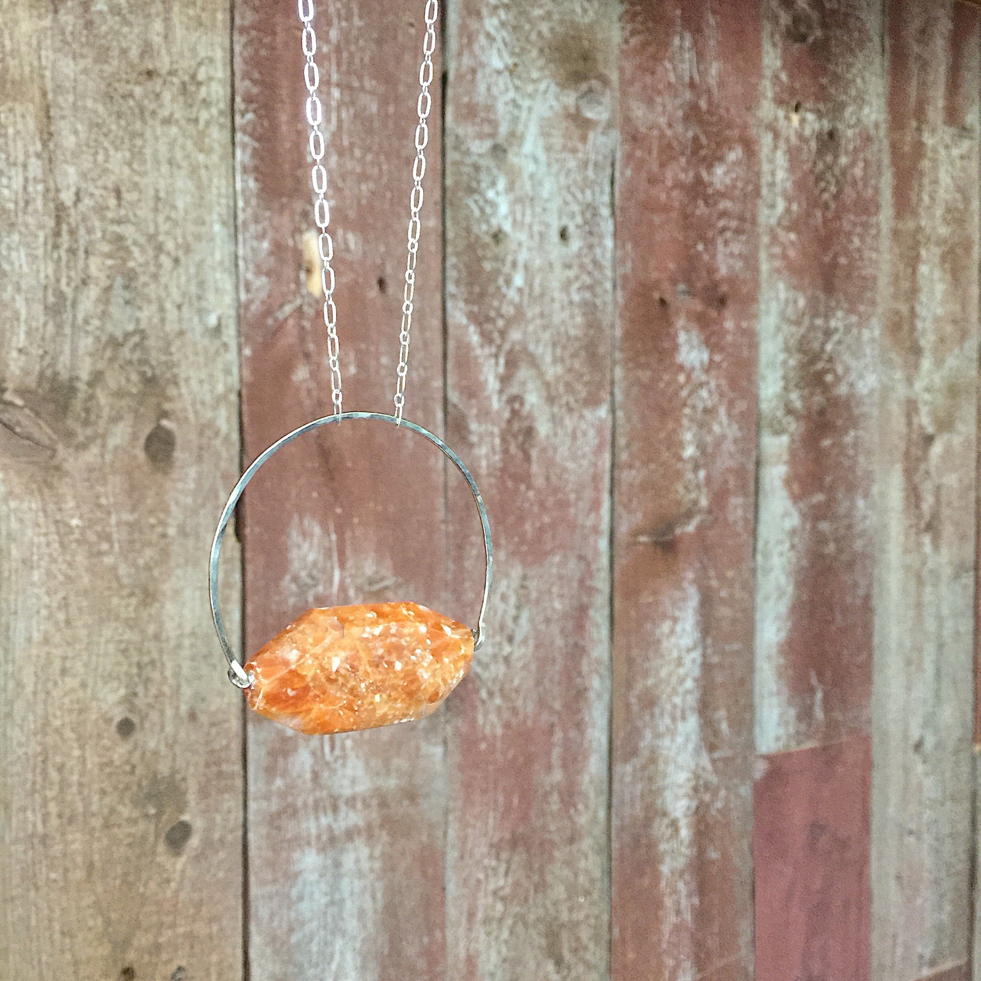 The Vela Necklace: orange Chalcedony met with a hand-hewn crescent bead frame in nickel and silver plated chain create this minimalist and colorful necklace.